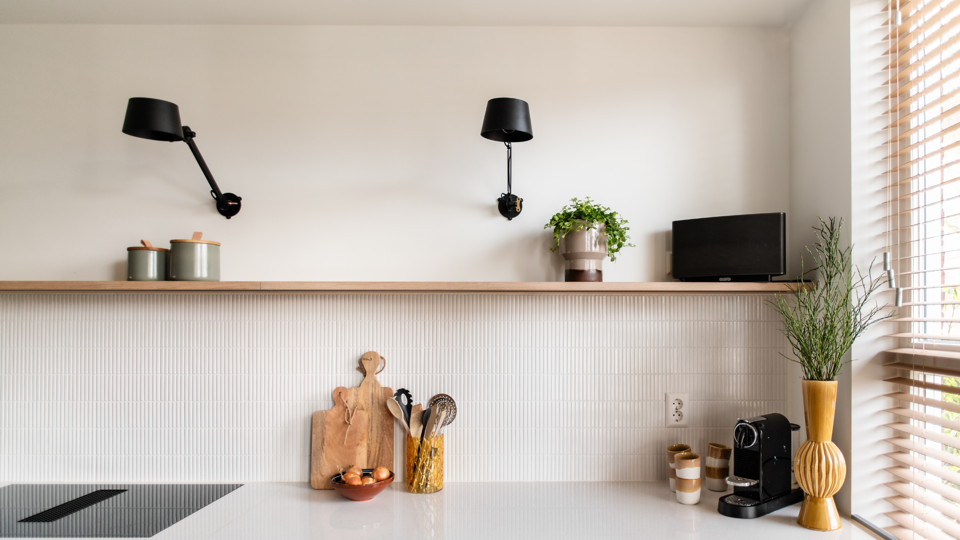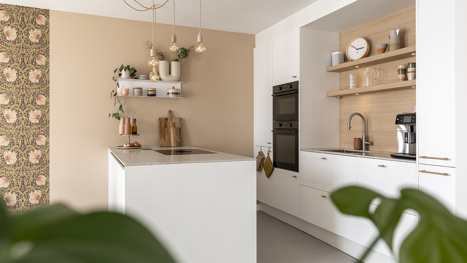 Staat je Japandi-keuken? Dan is het tijd voor de afstyling. Daar kun je veel kanten mee op. Denk aan bamboeschalen of houten snijplanken. Potten in zachte kleuren en keramisch servies. Voor een beetje kleur zijn planten perfect. Demi: “Bijvoorbeeld een hangplantje op de kast. Of een mooi boeket. Japandi is allesbehalve saai: het ziet er waanzinnig mooi uit.”