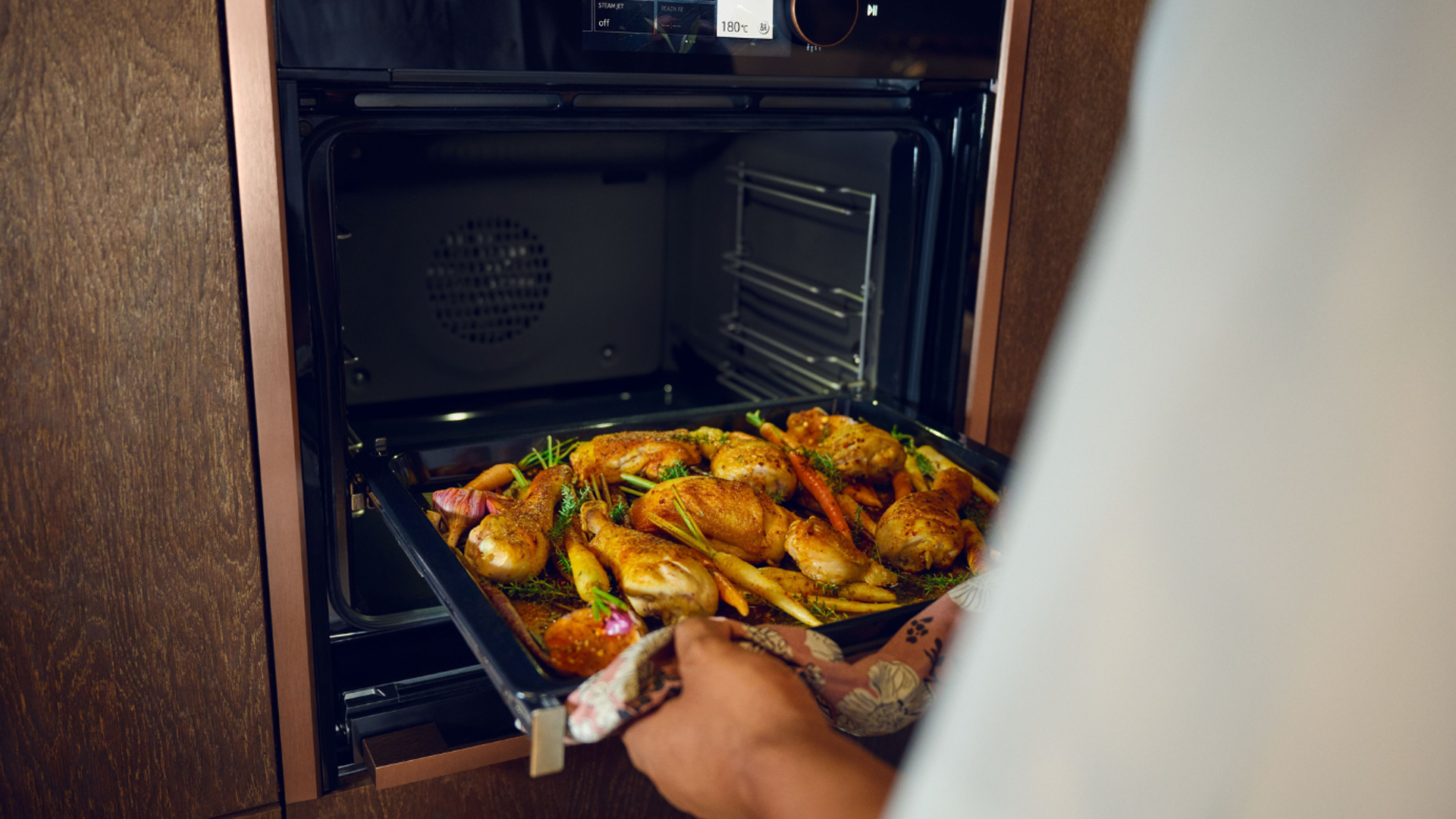 Als je voor een groot gezin kookt, weet je bijna niet waar je al die pannen moet laten. Een stoomoven is de uitkomst. Hiermee kun je veel tegelijk bereiden, zoals groenten en vlees. "Alsof je drie pannen tegelijk gebruikt. Of kies een inductieplaat met 6 pitten, genoeg ruimte voor je gerechten. Er zijn kookplaten waarbij je pitten kunt koppelen, ideaal voor extra grote pannen," zegt Joanne.