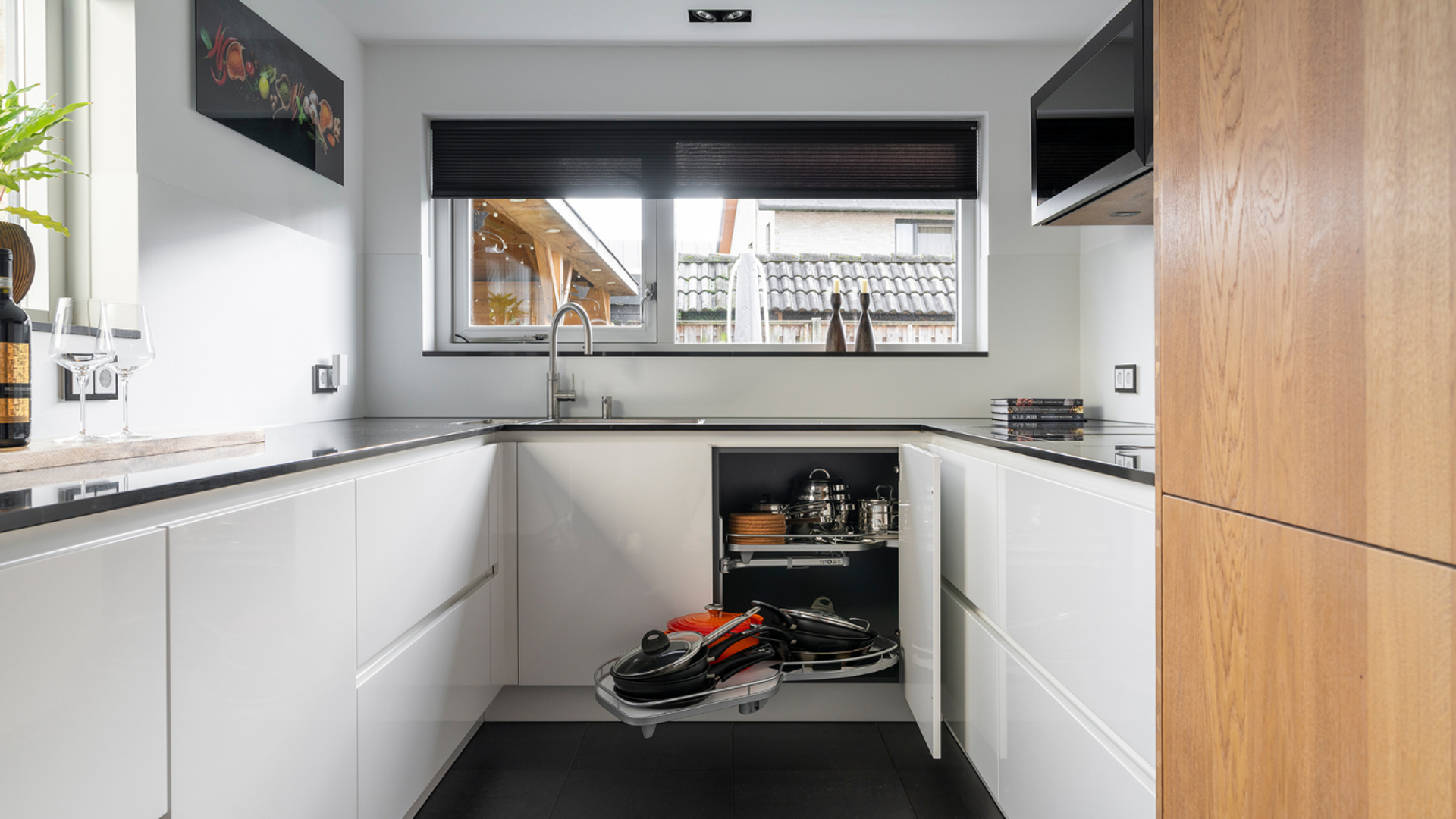 Een kleine keuken voor een groot gezin? Dat gaat niet. Je hebt opbergruimte nodig, en veel! Verkoopmedewerker Joanne heeft een goede oplossing: “Grote lades zijn een uitkomst, want daarin kun je 40% meer spullen kwijt dan op planken. En met al die pannen die je nodig hebt om voor iedereen te koken, is een hoekcarrousel perfect. Dat is een uitschuifbare lade met etages voor je keukenspullen.”