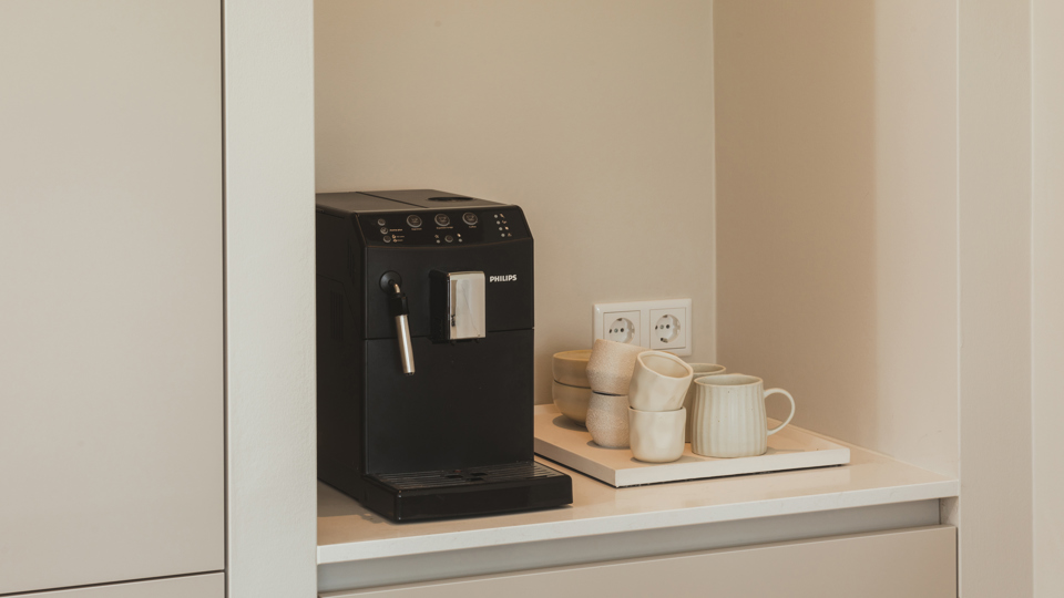 Een koffiecorner heeft meestal een vrijstaand koffiezetapparaat. “Met een inbouwmachine is het technisch gezien geen koffiecorner meer", legt Cornelis uit. “Maar veel klanten vinden het nisje alsnog handig. Je kunt er namelijk van alles kwijt.”