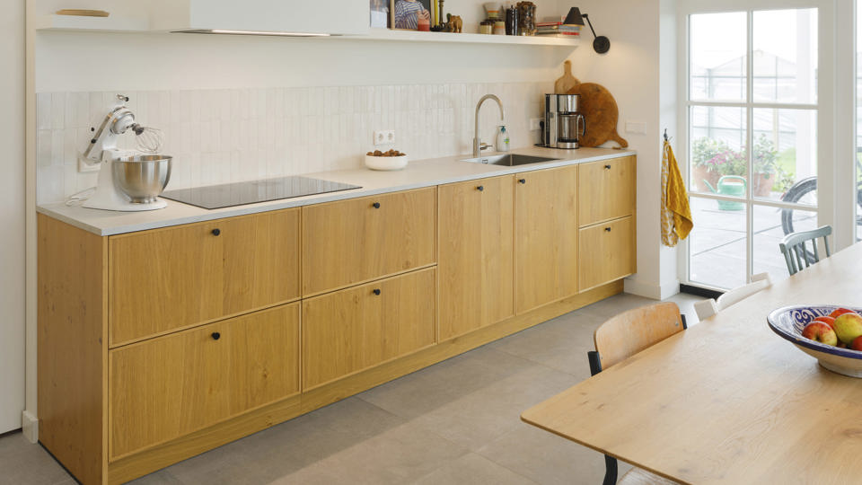 Een houten keuken vraagt wat meer oplettendheid. Zeker als het hout in aanmerking komt met vocht. Joanne: “Knoei je? Laat de vlek niet indrogen. Poets het meteen weg. Want zelf met een beschermende laklaag kunnen vlekken intrekken.” Etensresten ruim je natuurlijk altijd meteen op. Maar houten deuren met diepe noesten zijn lastiger schoon te maken, dus daar moet je nét wat alerter zijn op wat je achterlaat tijdens het koken en bakken.