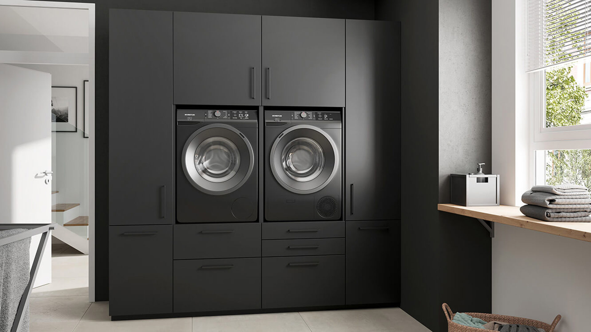 - Een hoge kast voor wasmachine en droger. Als je slim bent plaats je deze wat hoger, scheelt weer bukken. Ook kun je dan gelijk de wasmand onder de wasmachine opbergen.