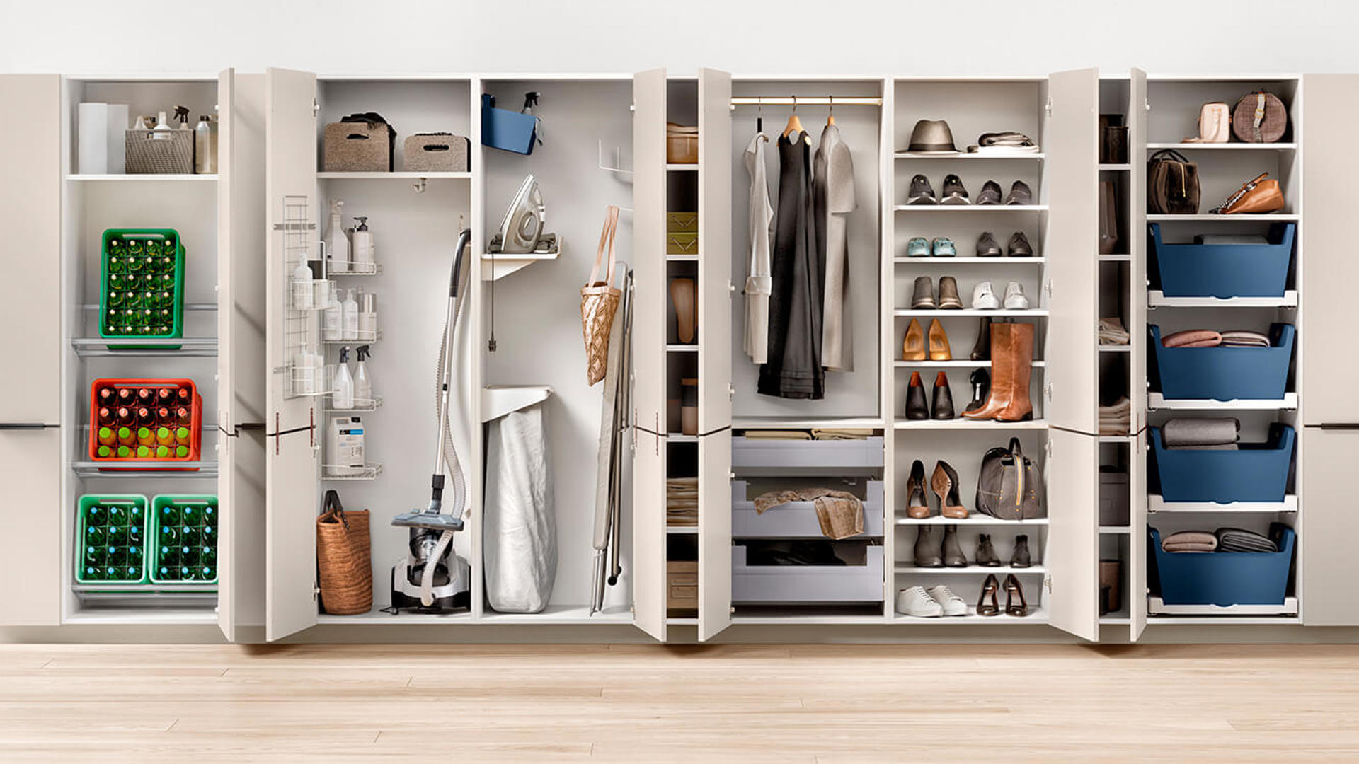 - Kastwand met hoge kasten voor grote huishoudelijke apparaten zoals strijkplank en stofzuiger.