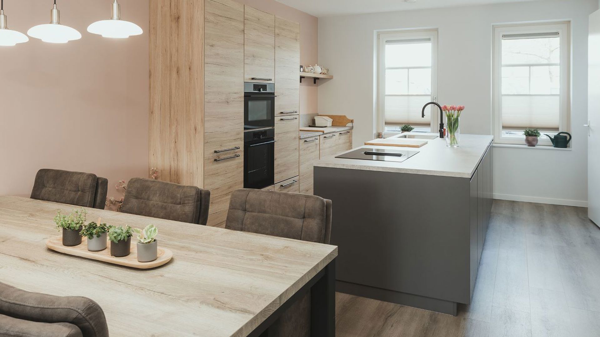 Een ander aandachtspunt is de kleur van de keuken. Omdat de open keuken overloopt in de woonkamer, kiezen veel mensen voor rustige fronten, in zand- of grijstinten. Jenneke adviseert het blad in dezelfde kleurstelling te doen. “Zo houd je het rustig. Met een behangetje of een kleur op de keukenmuur kun je alsnog uitpakken.”