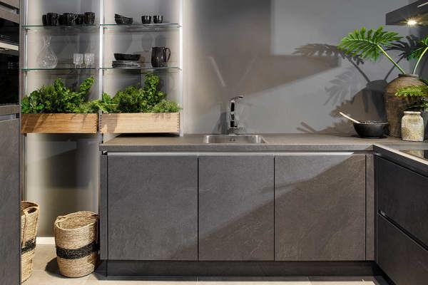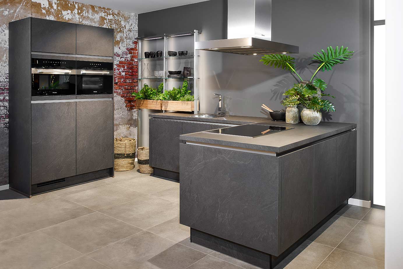 Deze mooie hoekkeuken is ton sur ton uitgevoerd in de kleur leisteen. Deze opstelling is compact en van ons merk DBselect. De keuken is voorzien van luxe Miele apparatuur en een kunststof werkblad.