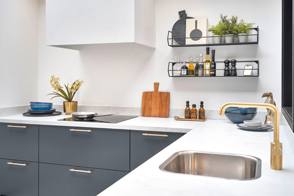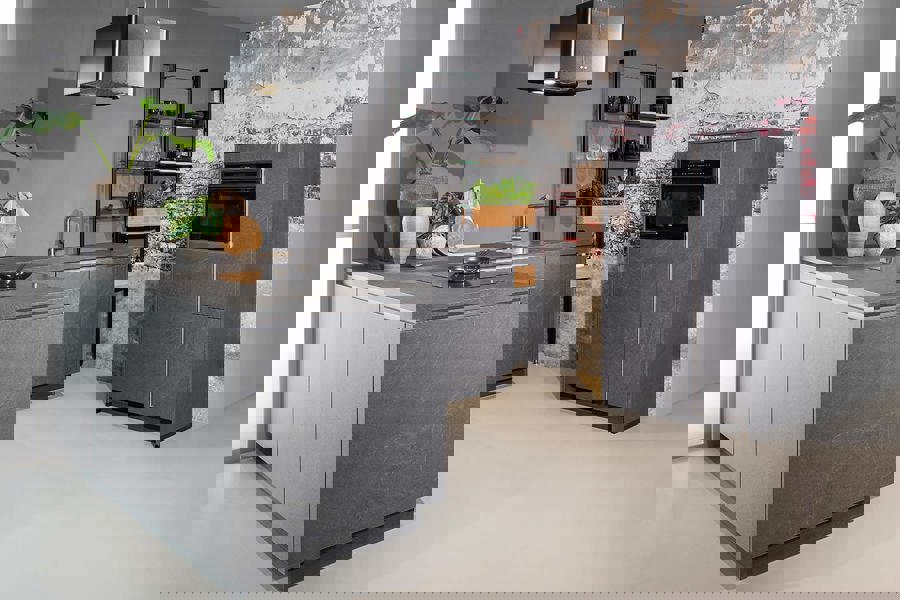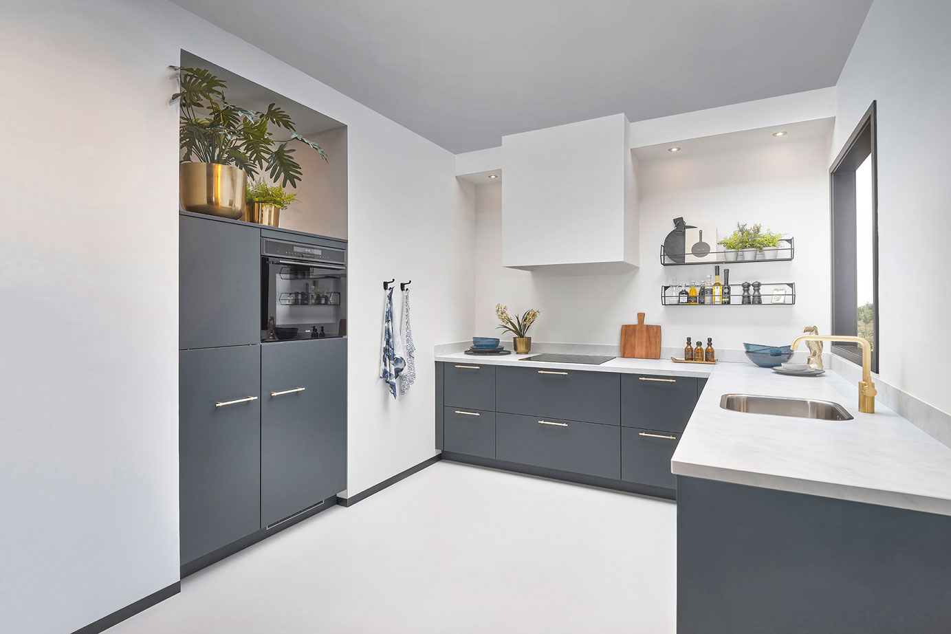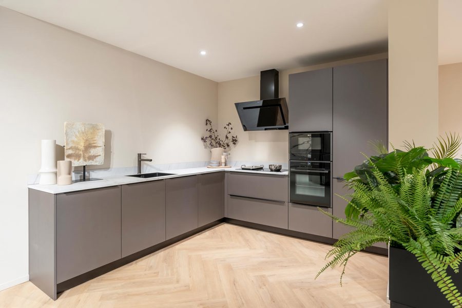 Deze grijze hoekkeuken biedt volop ruimte, werkmogelijkheden en is voorzien van een luxe keramiek aanrechtblad. Let ook op de design handgrepen die de grijze keuken een stoere uitstraling geven.
