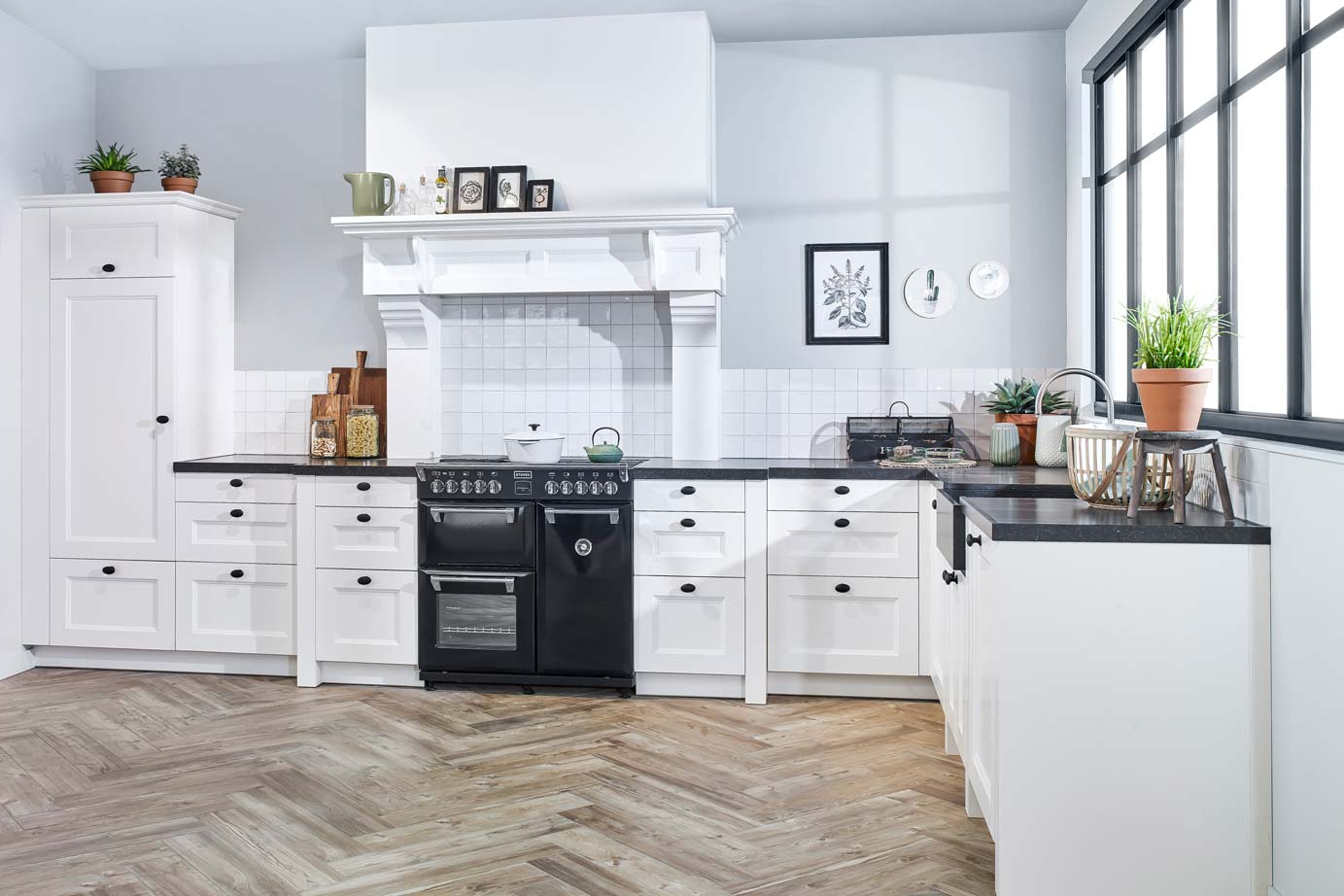 Dit is een klassiek landelijke keuken die past in het plaatje van grootmoeders tijd. Het fornuis, de grote schouw en de tegeltjes achterwand benadrukken het landelijk karakter. Let ook op de iets vooruitstekende spoelbak en de klassieke kraan.
