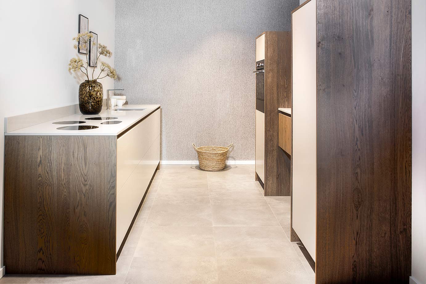 Een luxe greeploze keuken in parallelle opstelling. De kleurencombinatie geeft de keuken een warme uitstraling. Het werkblad in de keuken is van composiet.