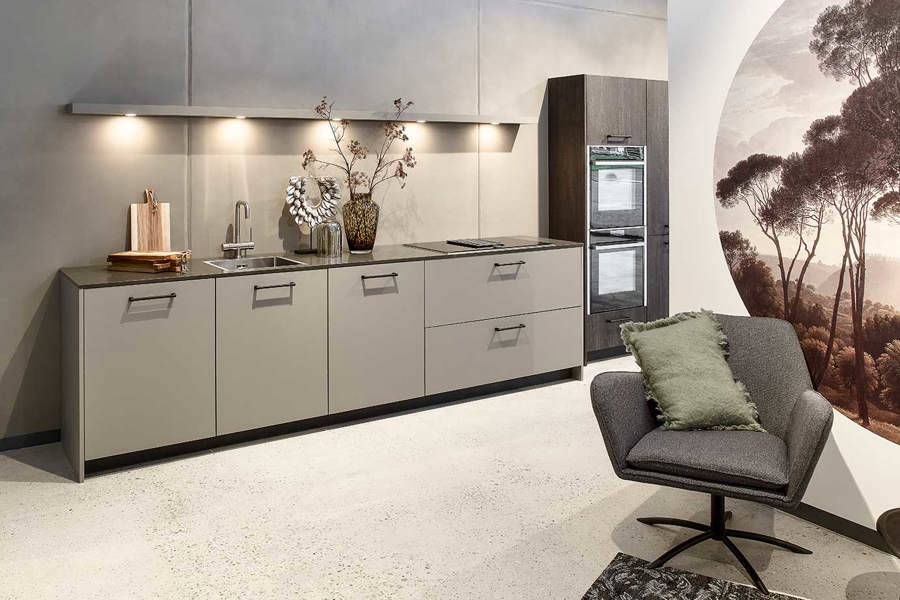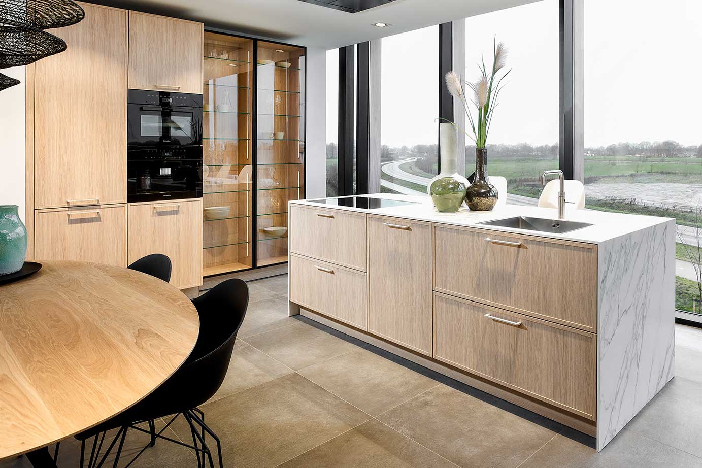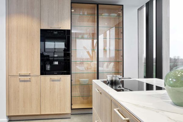 Een stijlvolle keuken met eiland, voorzien van een dun en doorlopend keramiek werkblad. Daarnaast zijn er twee hoge servieskasten met glazen deur. In deze keuken is hoogwaardige Miele apparatuur geplaatst.