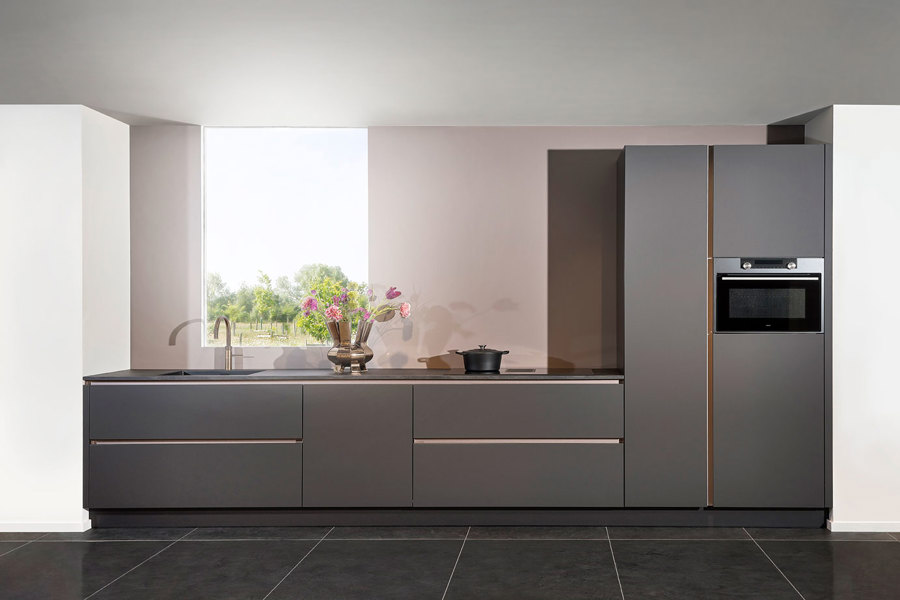 Deze ton sur ton keuken is extra speciaal doordat deze in matzwart is uitgevoerd. De keuken heeft een rechte opstelling en is voorzien van hoogwaardige apparatuur. Genoemde prijs is inclusief apparatuur en fenix werkblad.