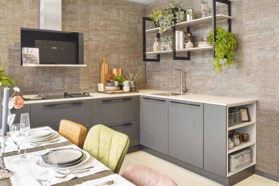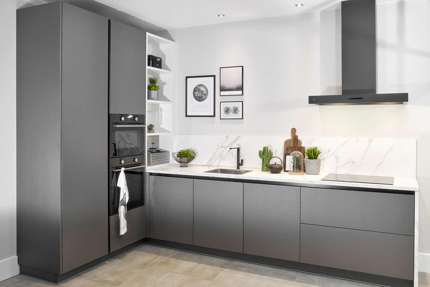 Deze moderne keuken is uitgevoerd in de trendy kleur antraciet en heeft een marmerlook werkblad en een marmerlook smetplint. Hierdoor is deze modern antraciete keuken helemaal van deze tijd.