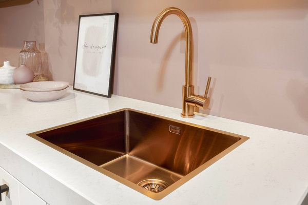 Een prachtige samenstelling in deze keuken van de stijlen modern en landelijk. De keuken is afgewerkt met stijlvolle, vierkante handgrepen en een kraan en spoelbak in de kleur copper, super chique!