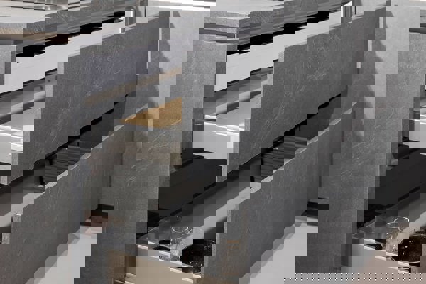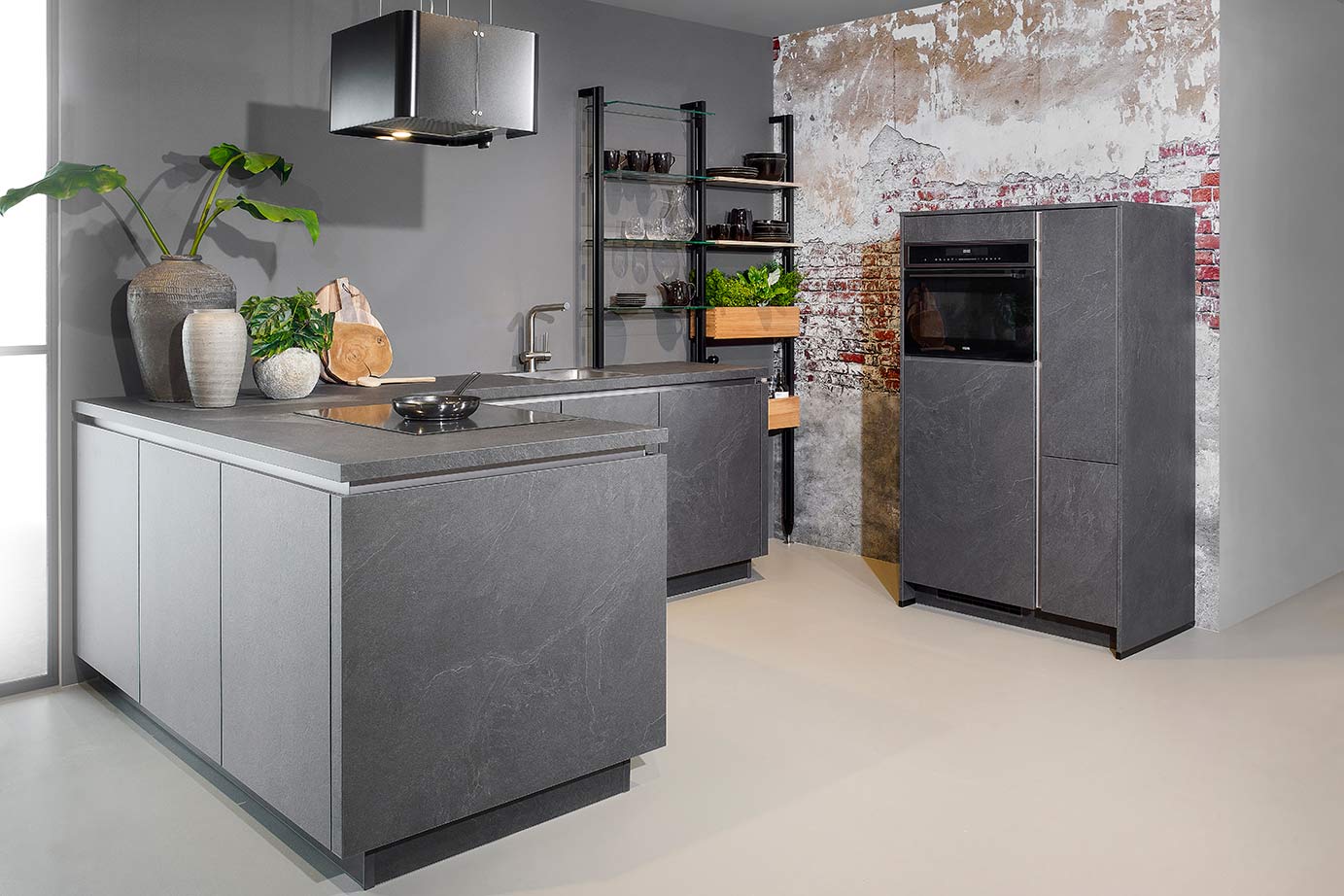 Een moderne grijze hoekkeuken in de kleur leisteen. Door de combinatie van het type front, het stalen wandrek en de wand erachter heeft de keuken een stoere uitstraling.