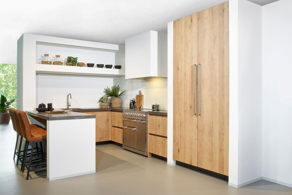 Een moderne houten keuken, uitgevoerd in een u-opstelling. De keuken is voorzien van een inductiefornuis. Door de u-opstelling met hoge kast is er veel opbergruimte aanwezig.