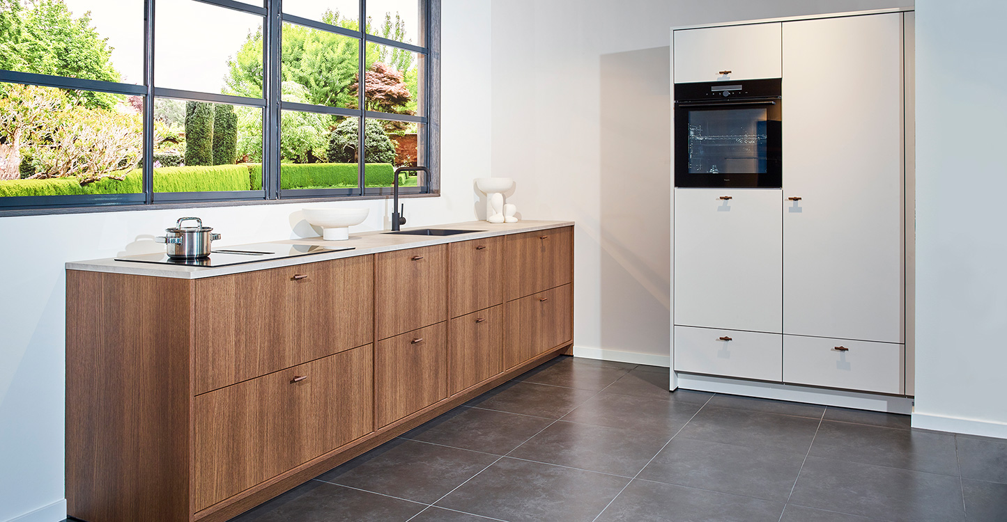 De fronten zijn van hout, wat zorgt voor een natuurlijke uitstraling. De witte kastenwand en de bronzen handgrepen maken het plaatje van deze moderne rechte keuken compleet.