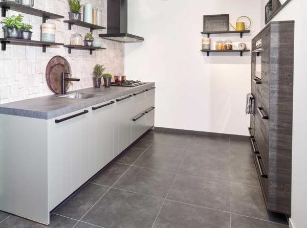 Een landelijk moderne keuken in parallelle opstelling. Hierdoor zijn de loopafstanden kort en de benodigde ruimte beperkt.