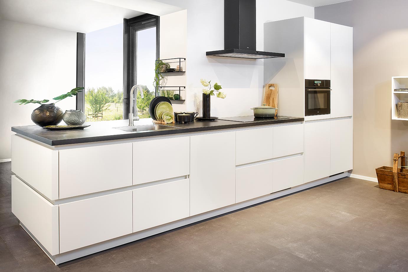 Bekijk deze rechte witte keuken. De keuken heeft voor een gedeelte een achterwand, het uiteinde staat vrij.