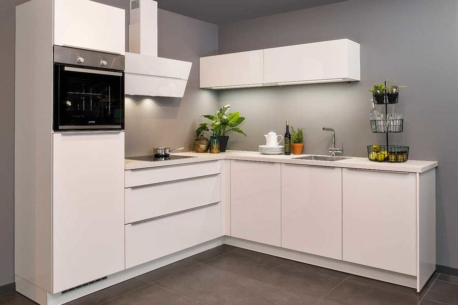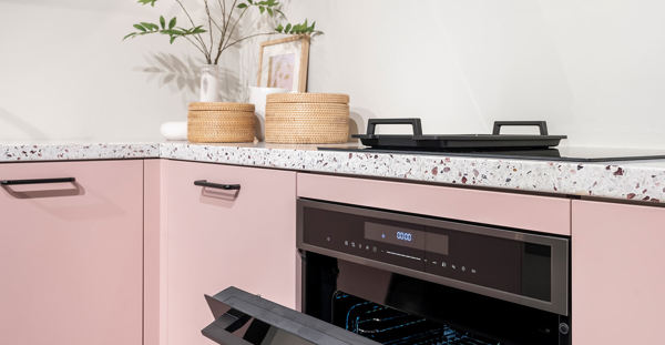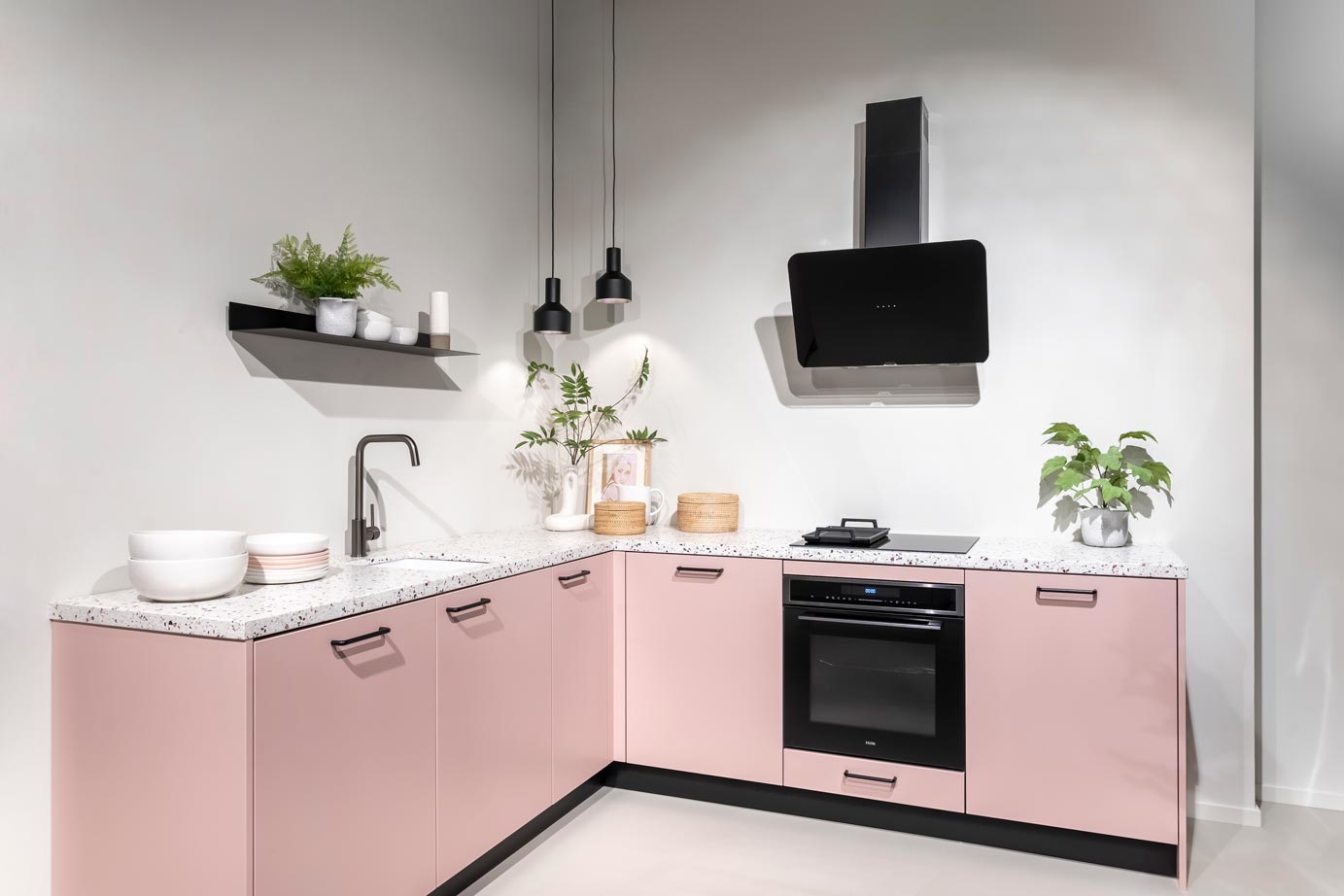 Upgrade je interieur met deze prachtige moderne keuken. De roze fronten geven je keuken een kleurrijke en gezellige uitstraling. Geniet van moeiteloos koken met de ETNA inductiekookplaat en oven met magnetronfunctie.