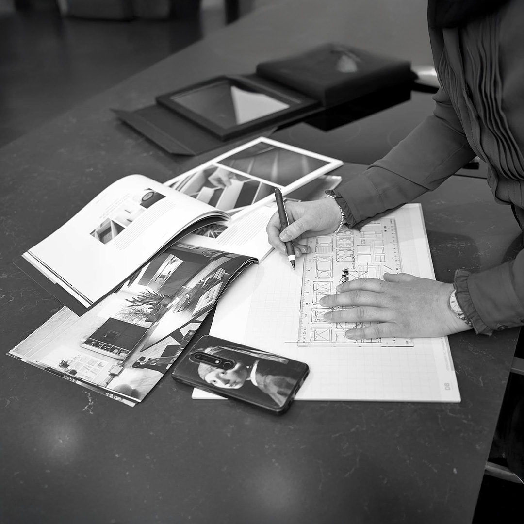 Wij vinden het leuk om met u samen aan de slag te gaan en in de showroom alle materialen en ingrediënten uit te zoeken, en dan samen met u het eerste schetsplan te maken van uw nieuwe keuken. Daarna maken wij een nieuwe afspraak voor de presentatie van een gedetailleerde, uitgewerkte plan en een kostenbegroting.