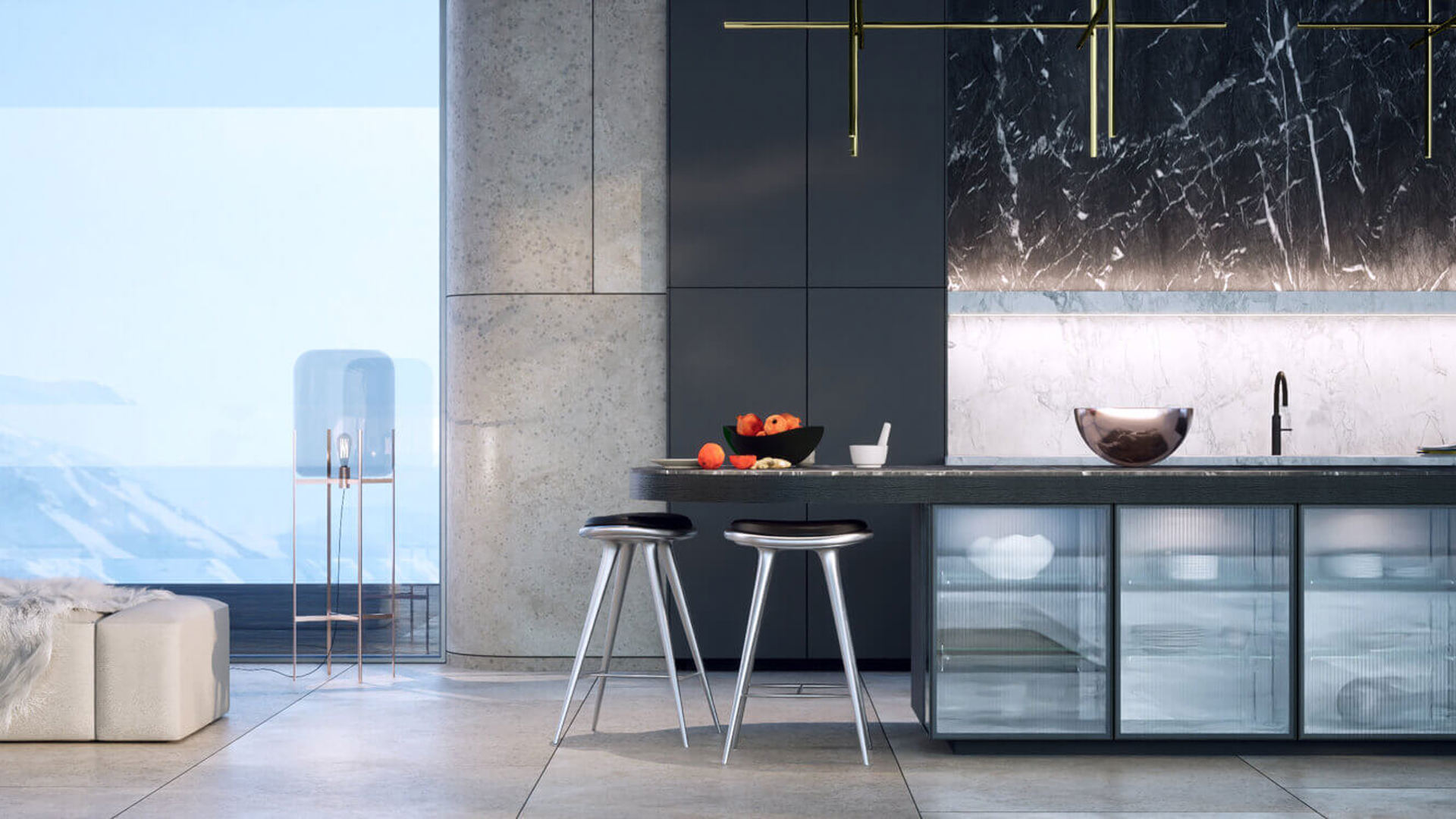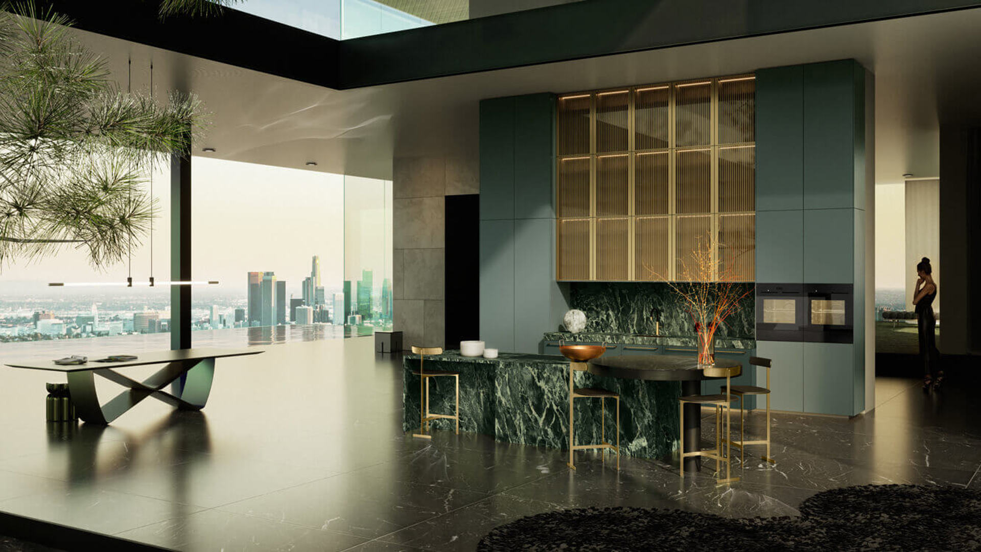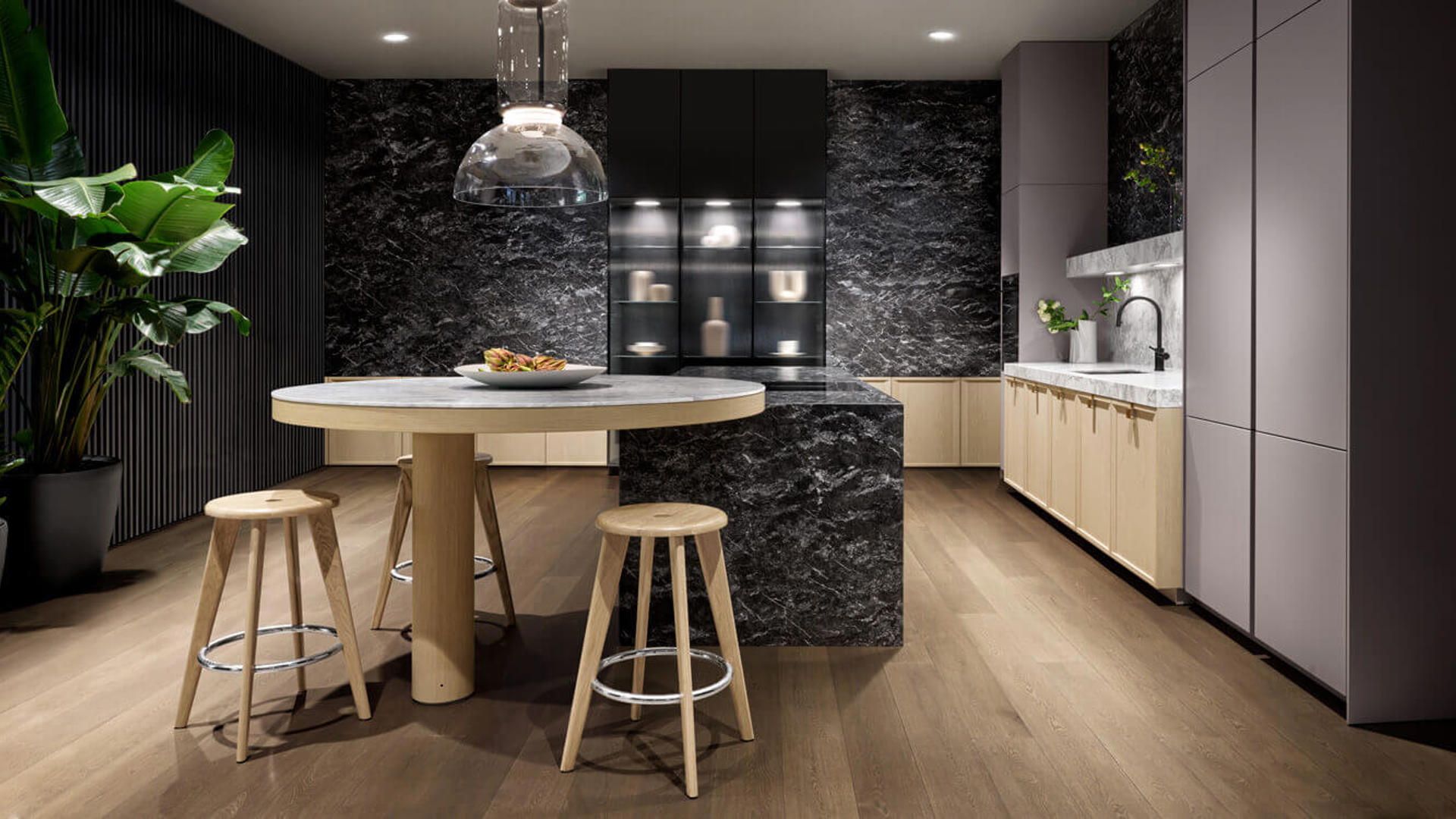 Kenmerkend voor SieMatic Mondial is ook dat deze lifestyle past binnen een context van architectuur. Steen, zoals composiet en keramiek, wordt veelvuldig toegepast op een manier die vooral heel aanwezig, sprekend en levendig is met overdadige aderingen en aanwezige structuren.