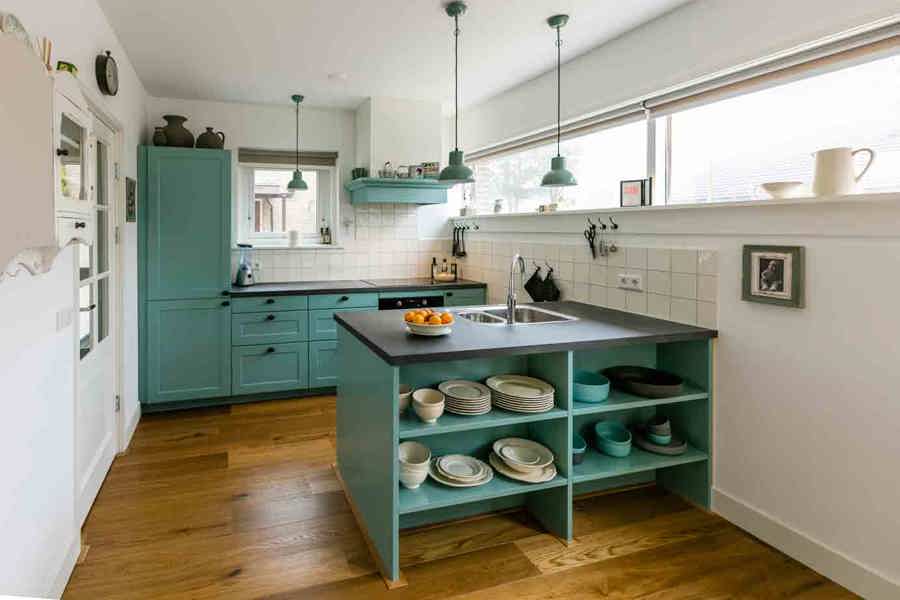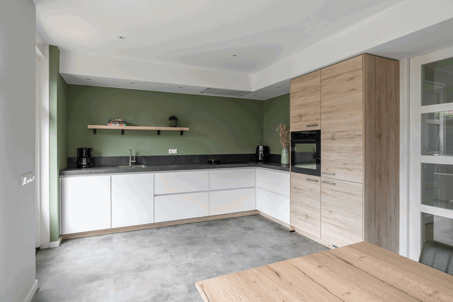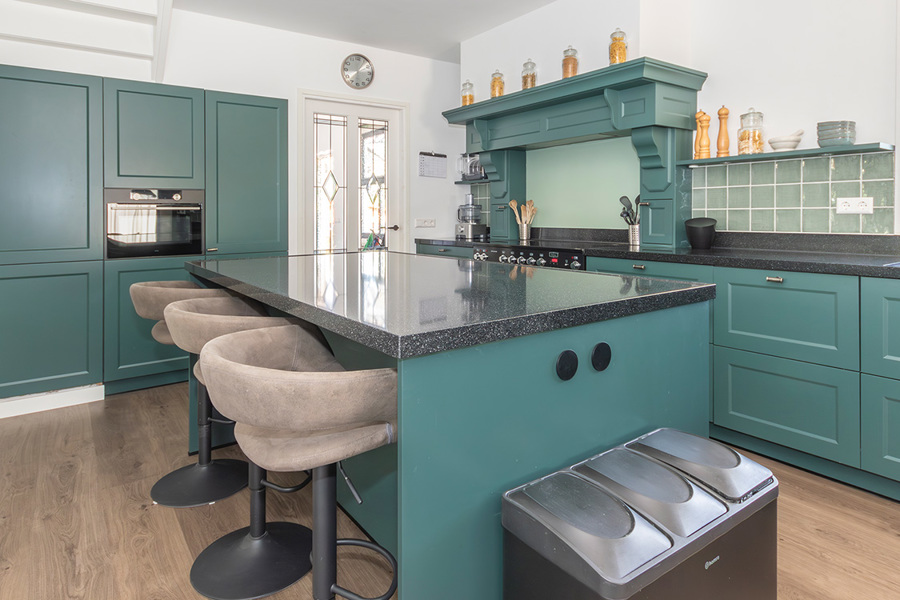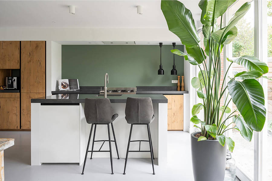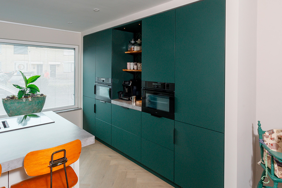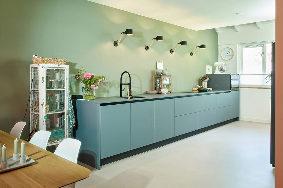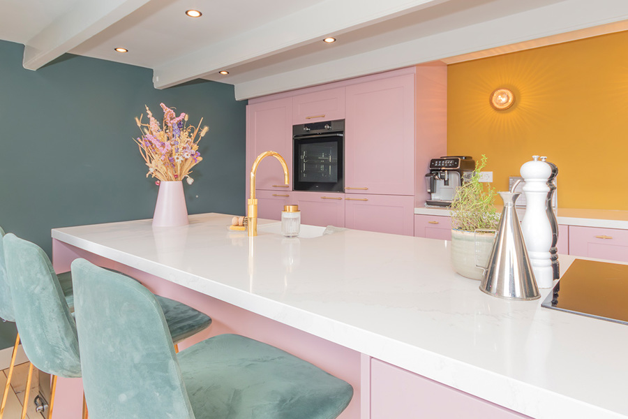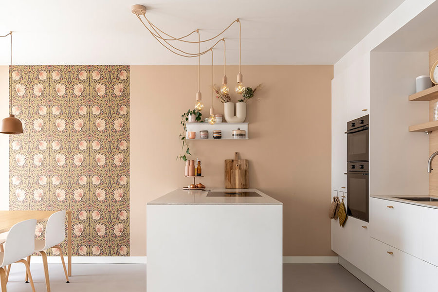Koraalrode keuken, ton sur ton met roze en groen interieur