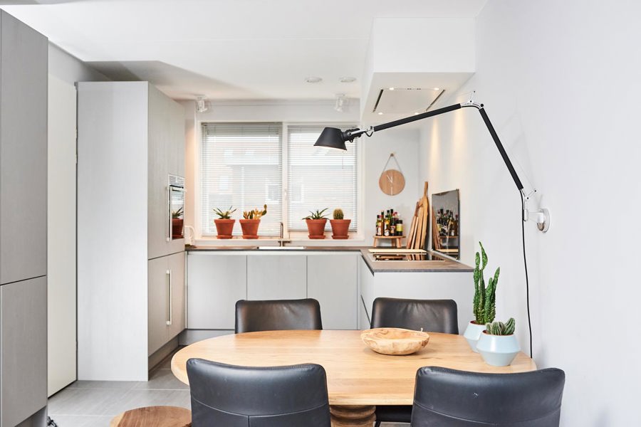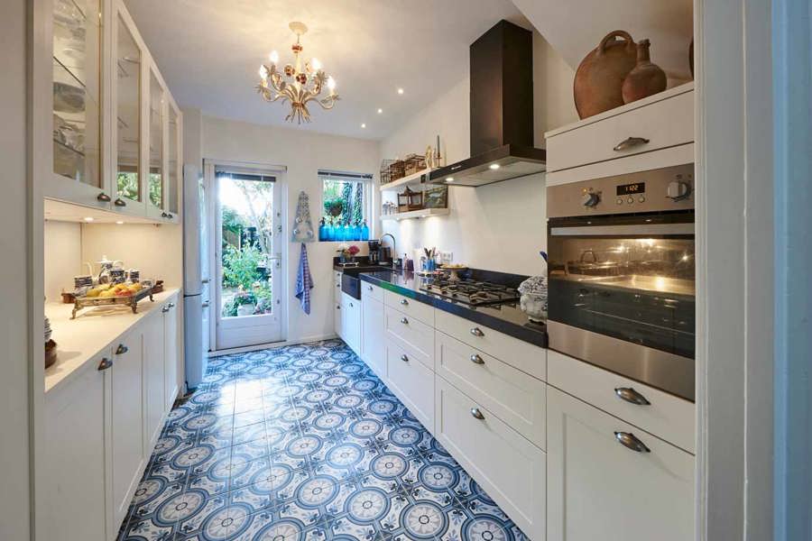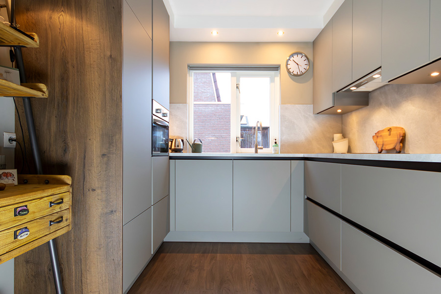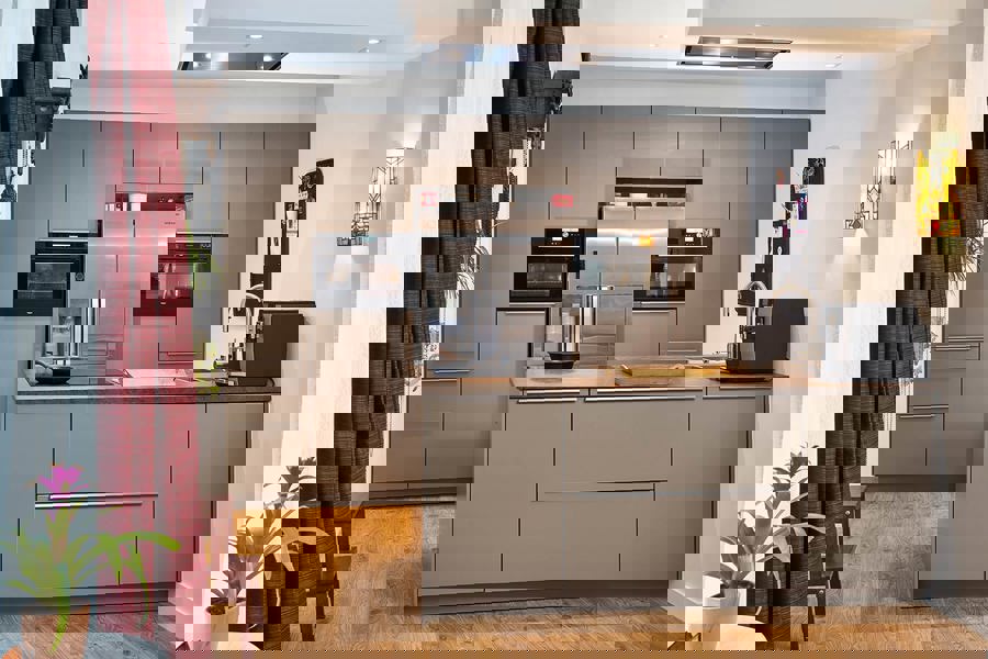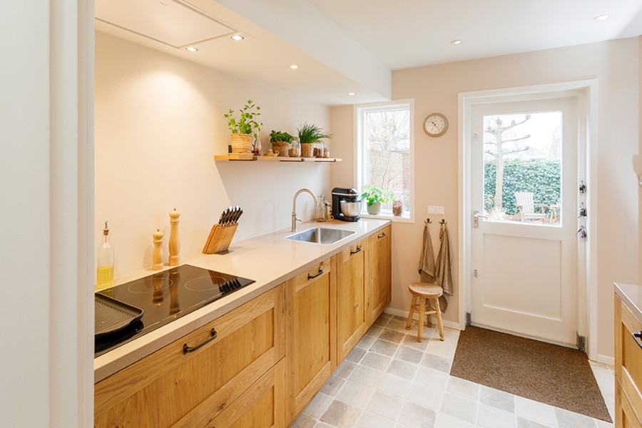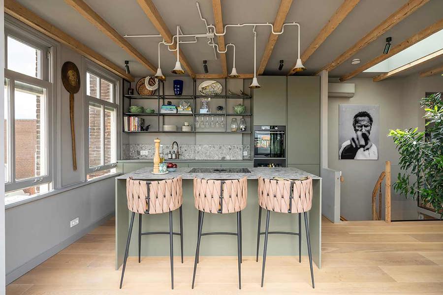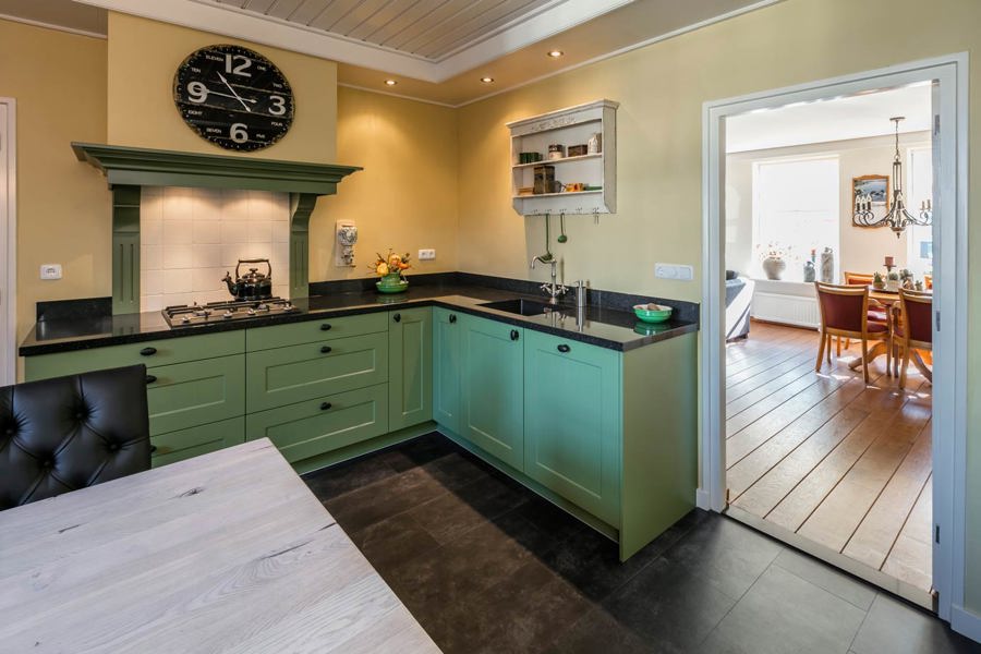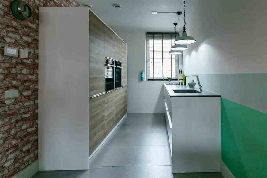 Koraalrode keuken, ton sur ton met roze en groen interieur