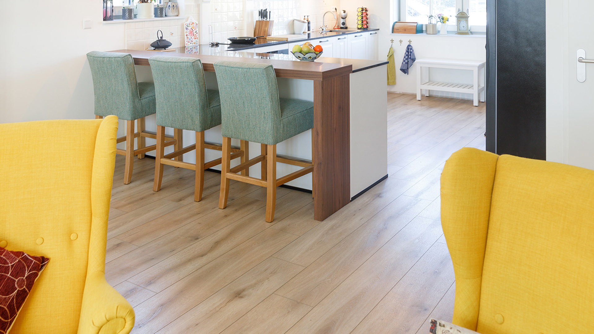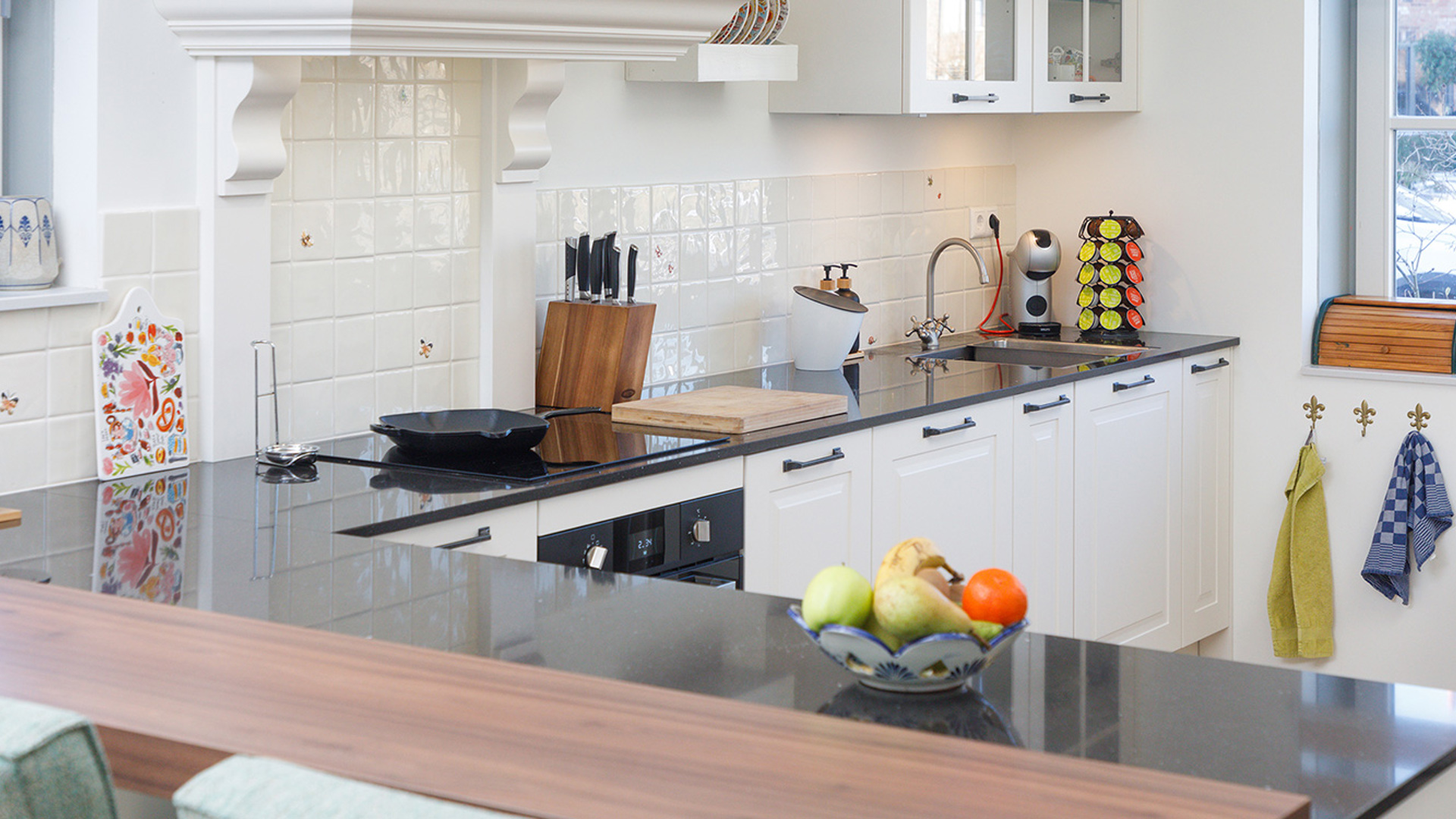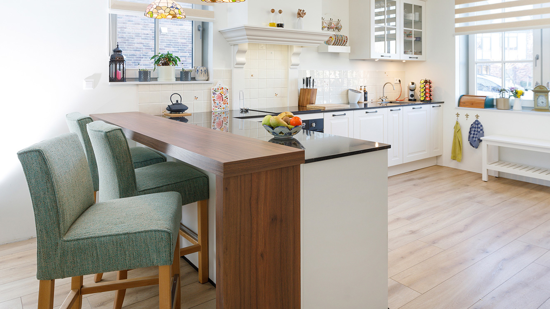 Wit heeft de voorkeur, hoewel Olessya ook erg weg is van een donkergroene keuken. Maar wit wordt het ‘m dan toch, het is neutraler en ze vinden het makkelijker combineren met de bar van donker hout.