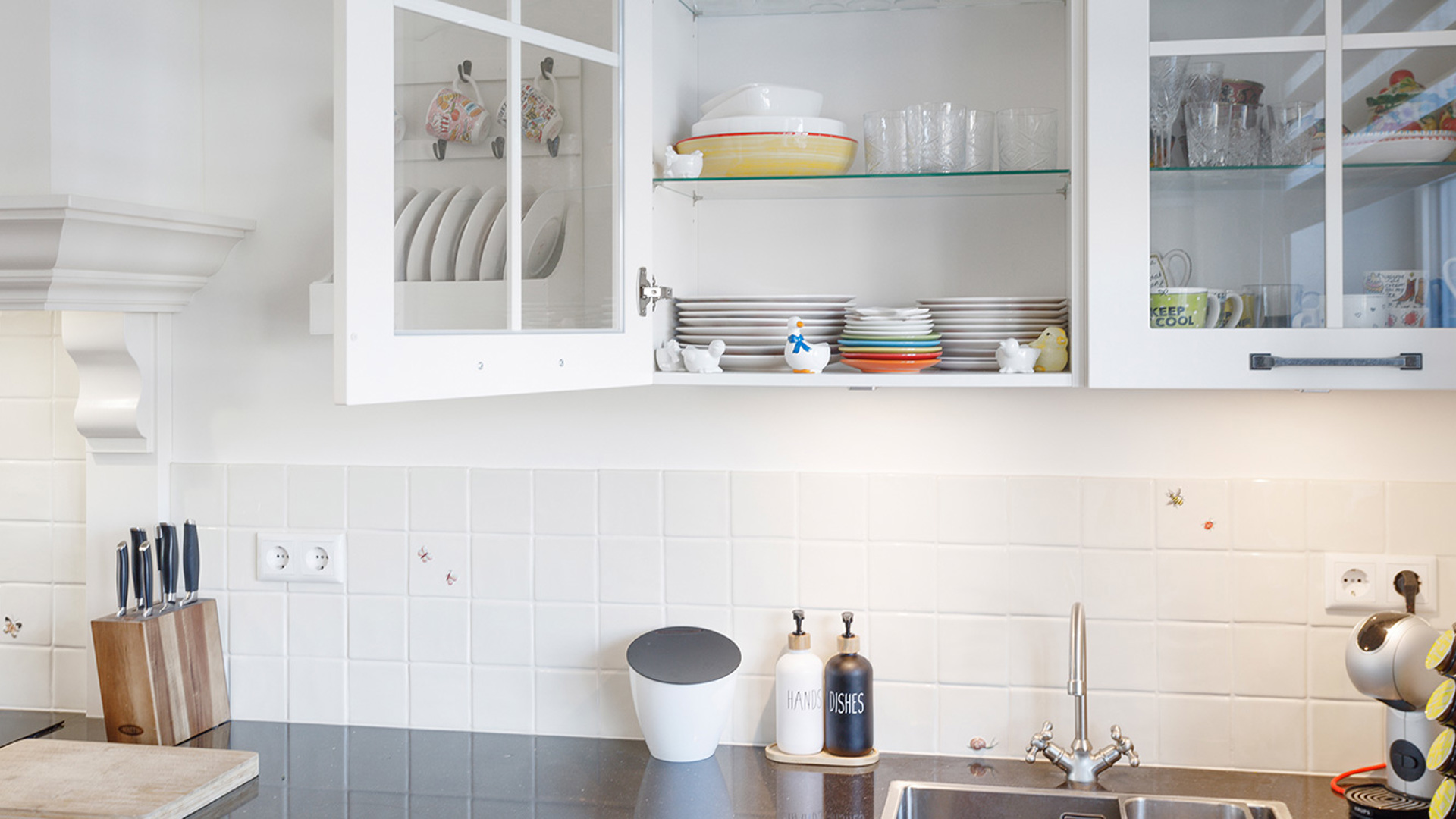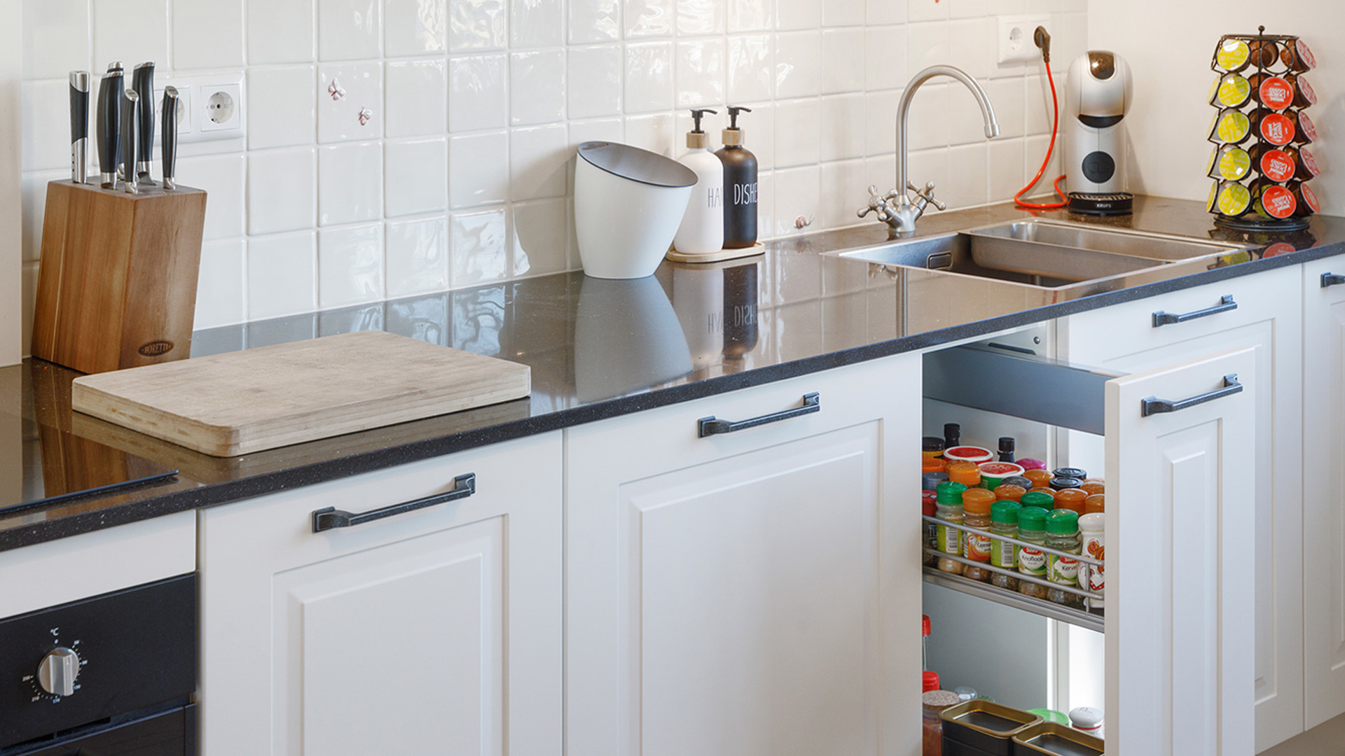 Ook de apothekerskast is ideaal. Kruiden, kruidenmixen, oliën, het staat er allemaal keurig geordend. De inhoud trek je naar buiten toe dus je hoeft niet diep achterin een kast te duiken. Ook dit aspect van de keuken bevalt goed.