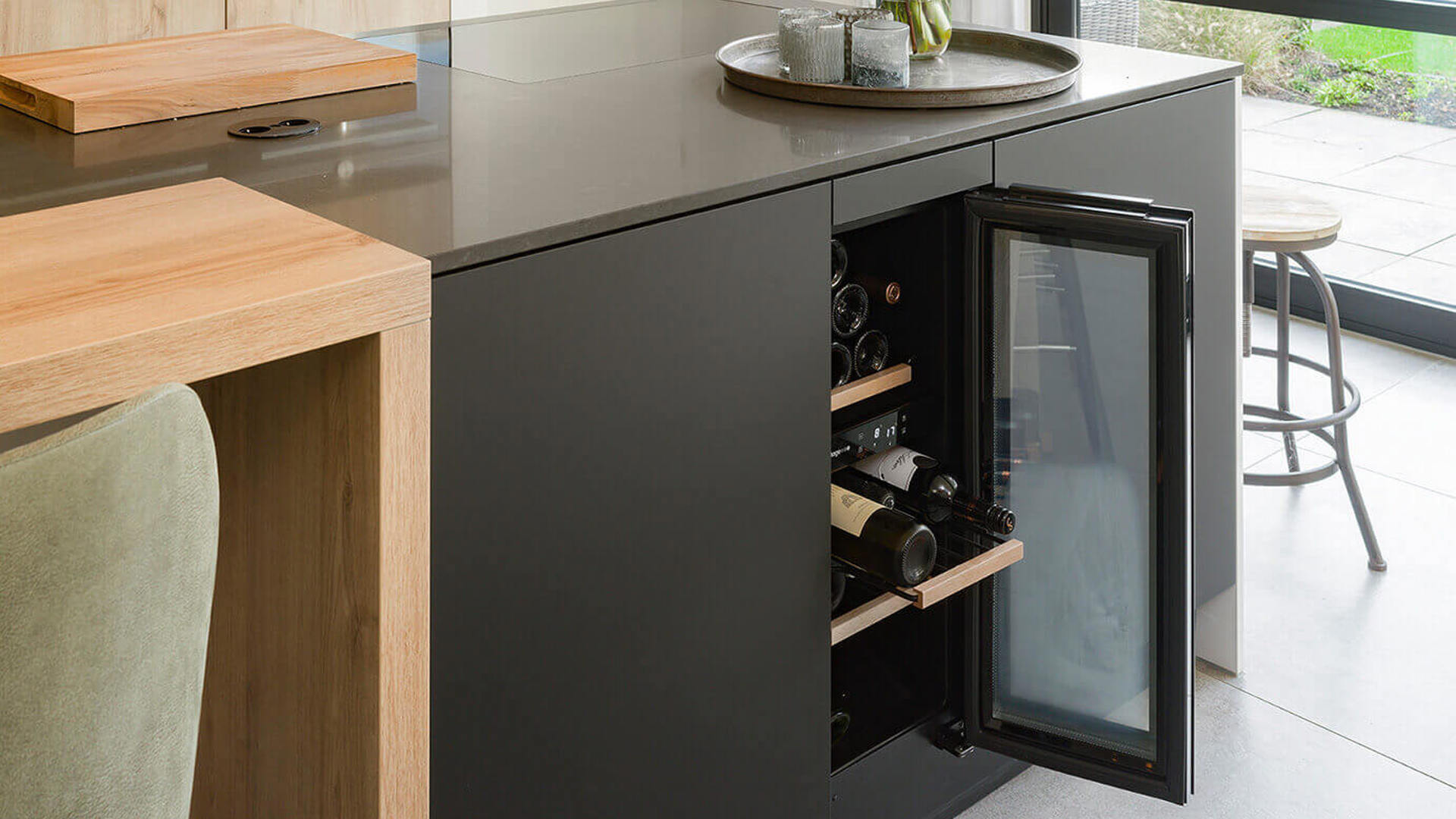 Deze keuken is ruimtelijk en compact tegelijkertijd. Er is alle ruimte om heerlijk te werken en je hebt alles binnen handbereik. 's Morgens pak je de ontbijtspullen uit de koelkast en je ontbijt aan de bar. Knus.