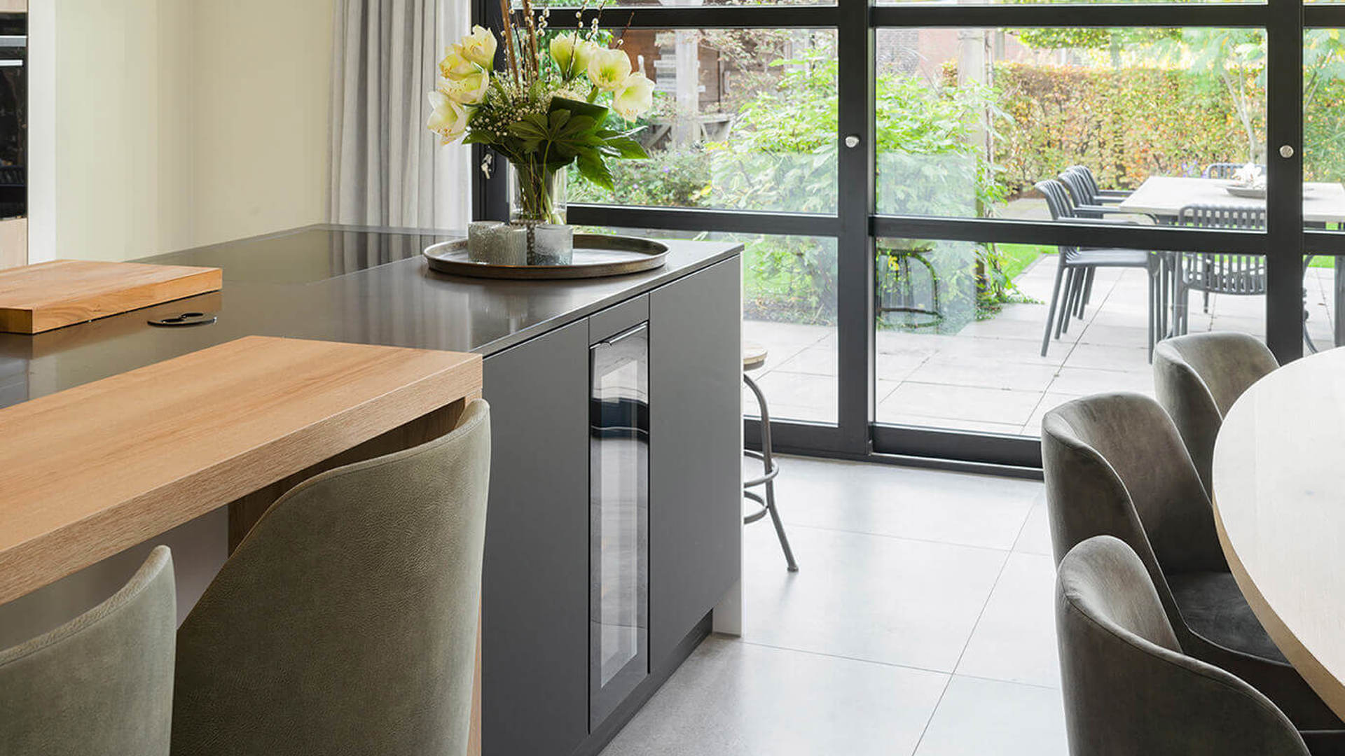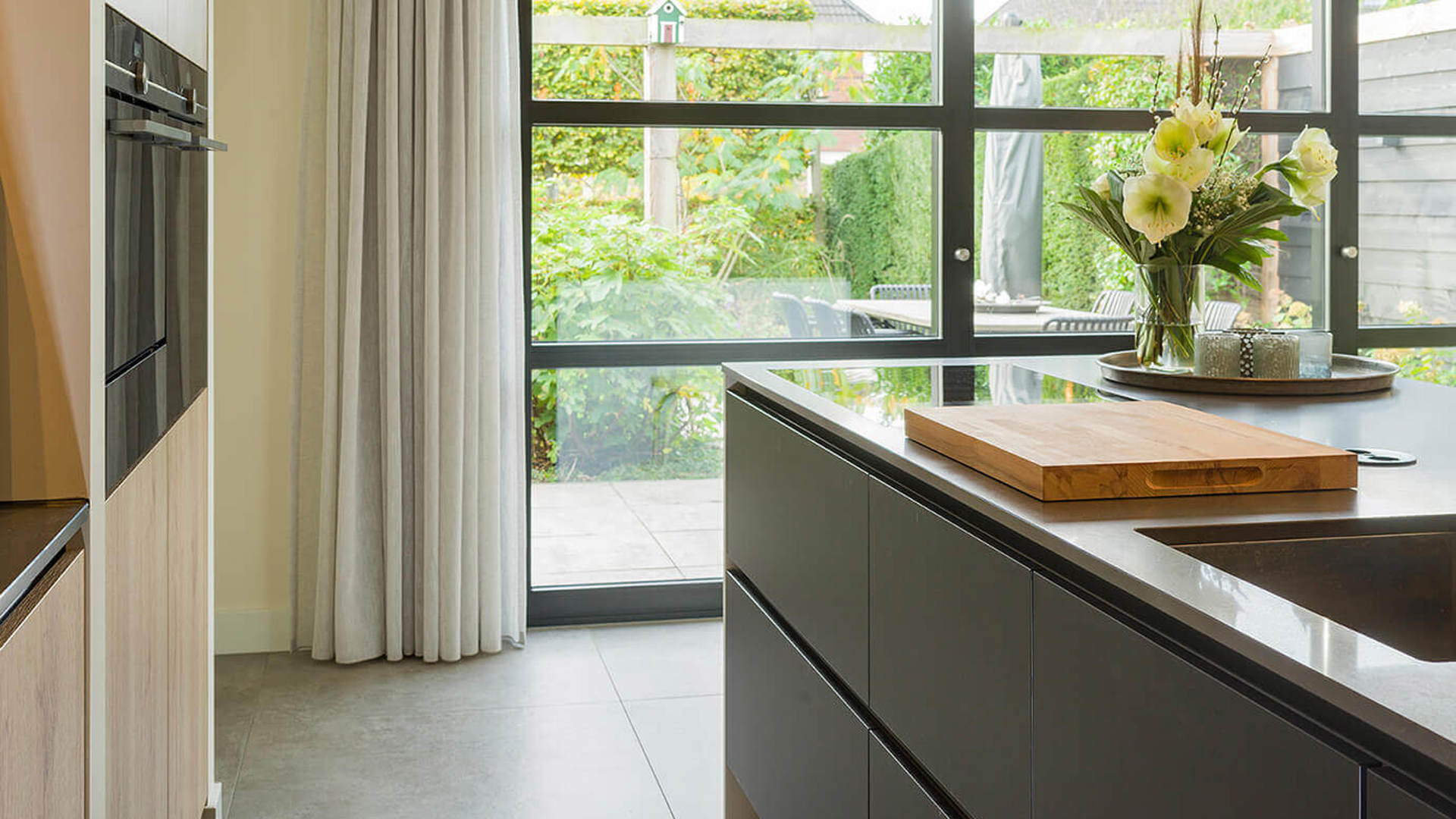 "Wij zijn tuinliefhebbers, dus wij wilden de tuin naar binnen trekken, of, zoals je het bekijkt, de keuken naar buiten. Dat is gelukt zo."