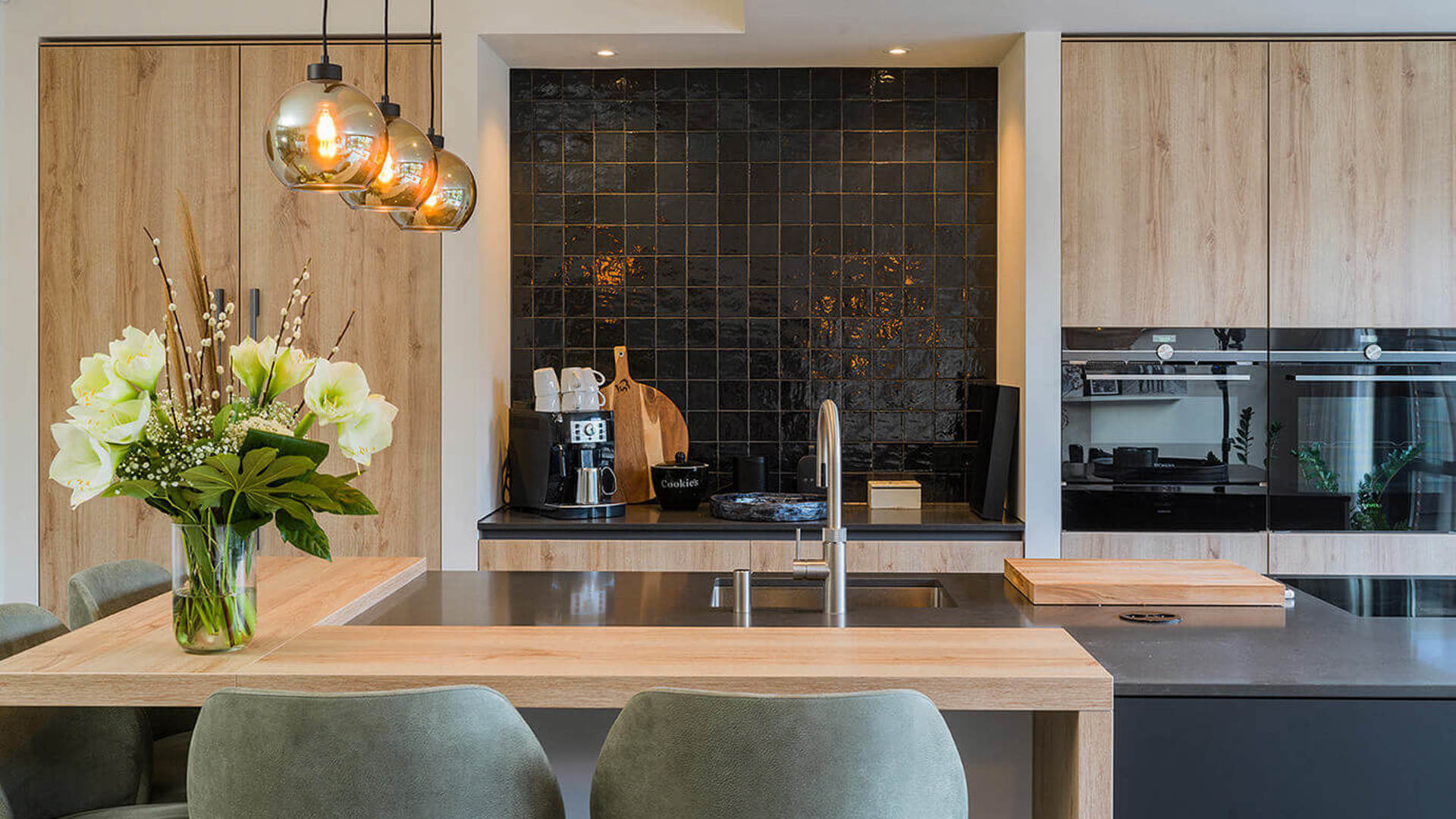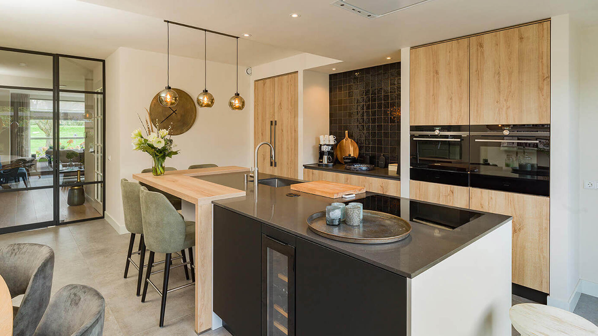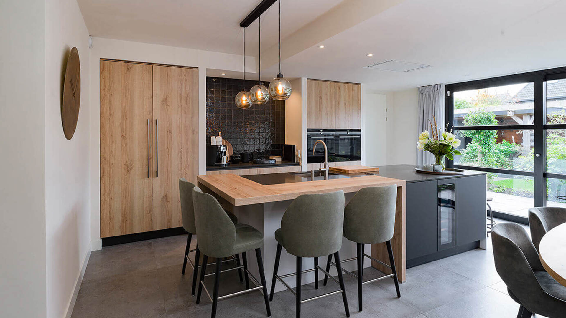 Nu zie je vanuit het woongedeelte het hout. Dat geeft een warm, landelijk accent aan deze moderne keuken. Heel mooi."