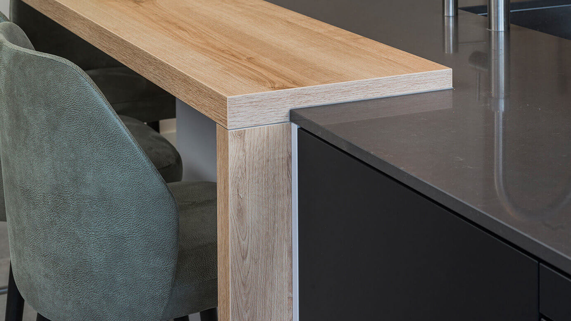 Het werkblad is afgestemd op de vloertegel. Zijn dikke werkbladen de trend, Pim en zijn vriendin gaan liever voor dun.