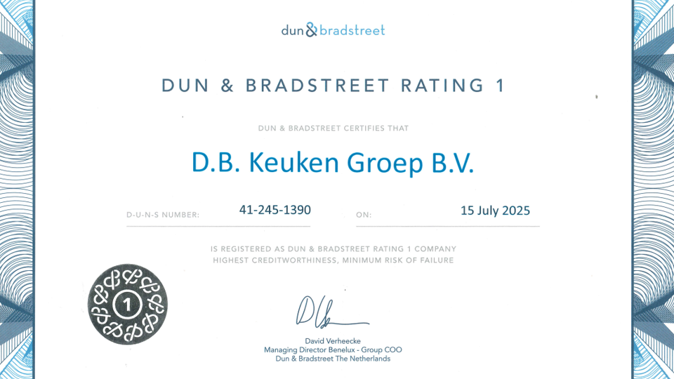 D&B Rating 1 geeft aan dat DB Keukens een financieel gezond en sterk bedrijf is. Een betrouwbare partner voor de aanschaf van een nieuwe keuken en / of badkamer.