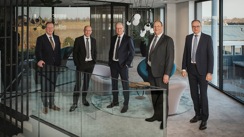 Van links naar rechts: H. de Deugd (HRM directeur), W. van Lit (financieel directeur), A. de Bruin (algemeen directeur), A.J. van Dijke (oprichter en eigenaar) en W. Roordink (operationeel directeur).