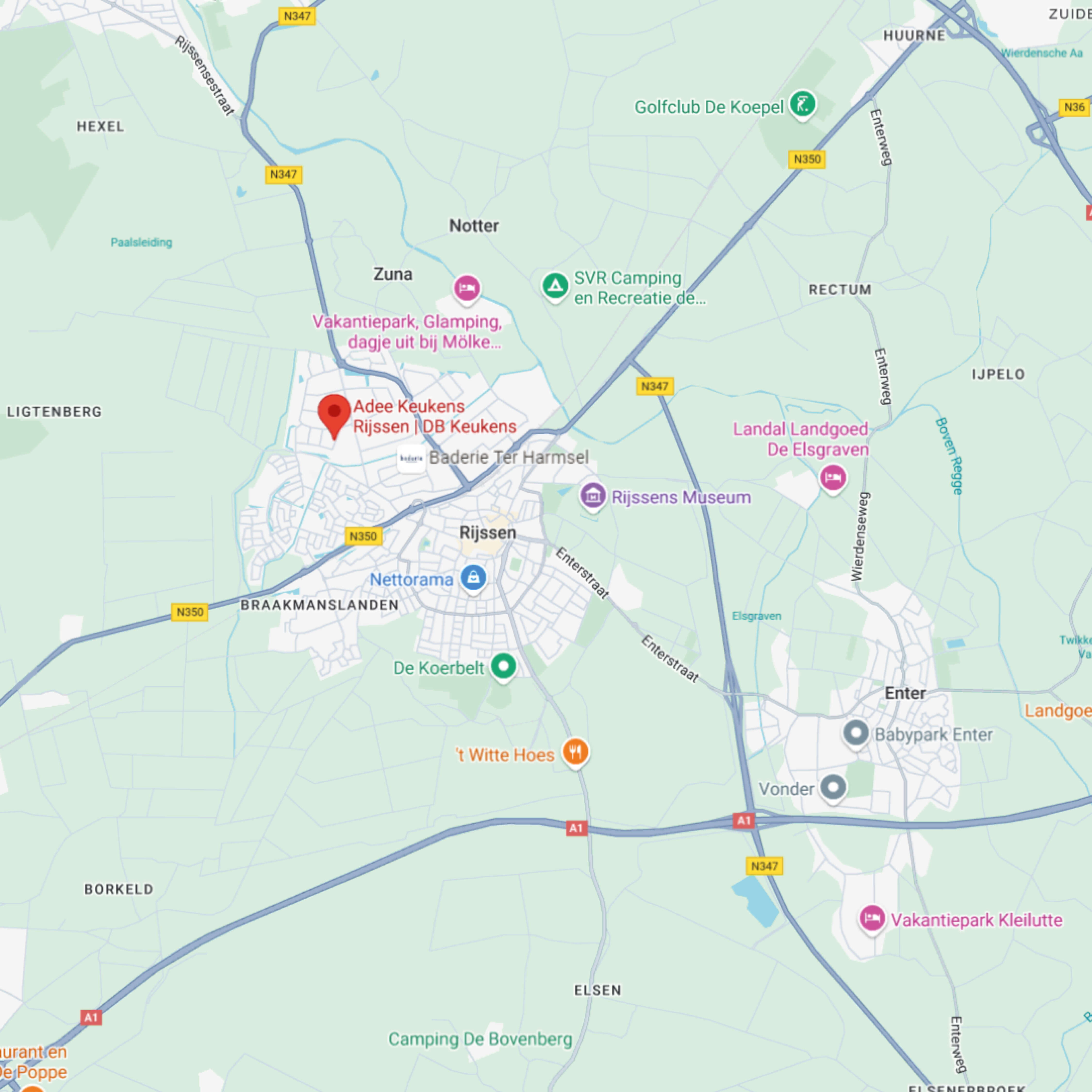 Als u buiten Rijssen woont, hoeft dat geen belemmering te zijn om onze showroom te bezoeken. DB Adee Keukens is uitstekend bereikbaar, zelfs als u van ver komt. Na het verlaten van de A1, bent u in minder dan 15 minuten al bij onze mooie keukenshowroom.