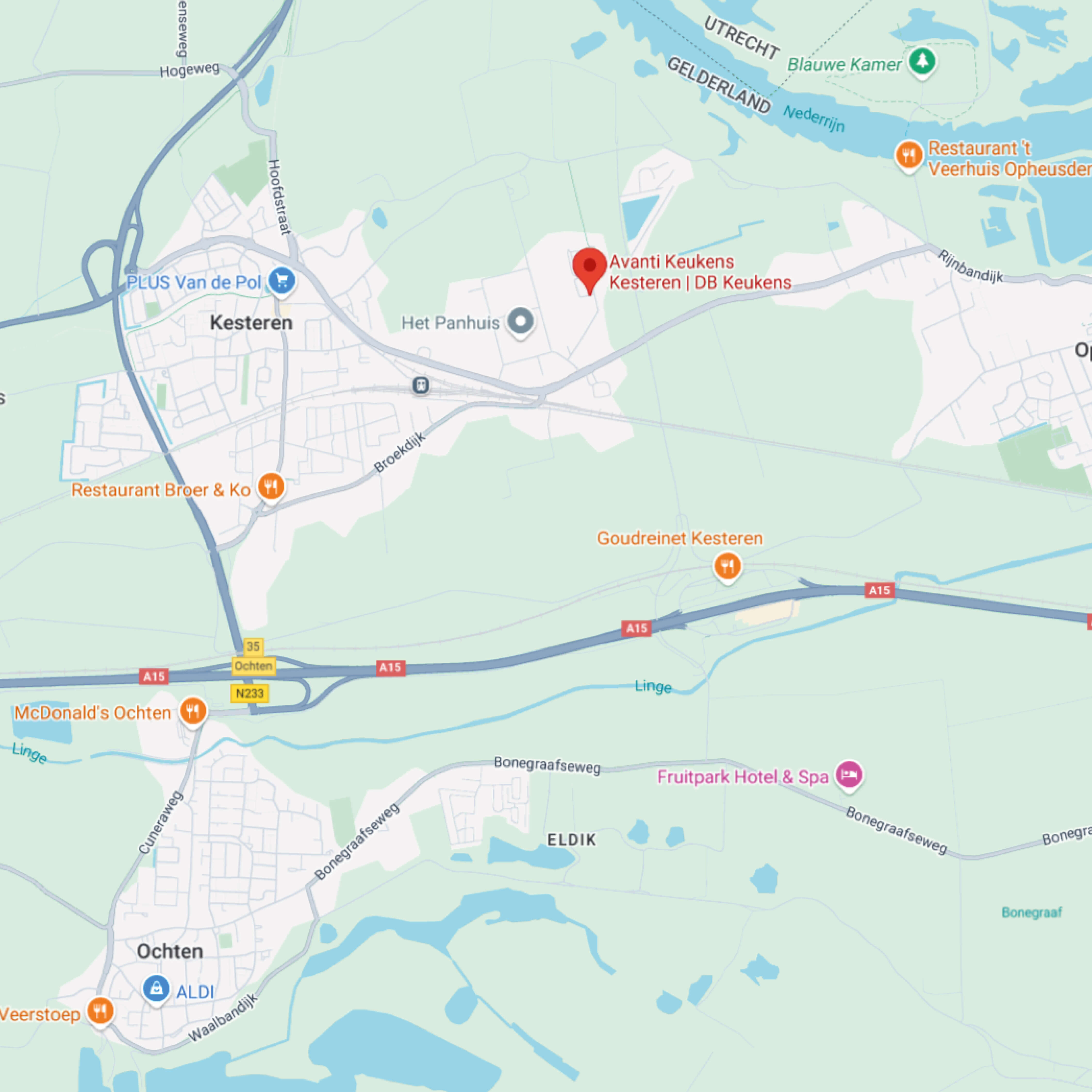 Bij DB Avanti Keukens heeft u het voordeel dat we gevestigd zijn te midden van een inspirerende woonomgeving. En dan bedoelen we niet zo'n drukke Woonboulevard in de stad met lange wegen, verkeerslichten en parkeerproblemen, maar juist een prachtige landelijke boulevard in de Betuwe. En geloof ons, die is echt de moeite waard!