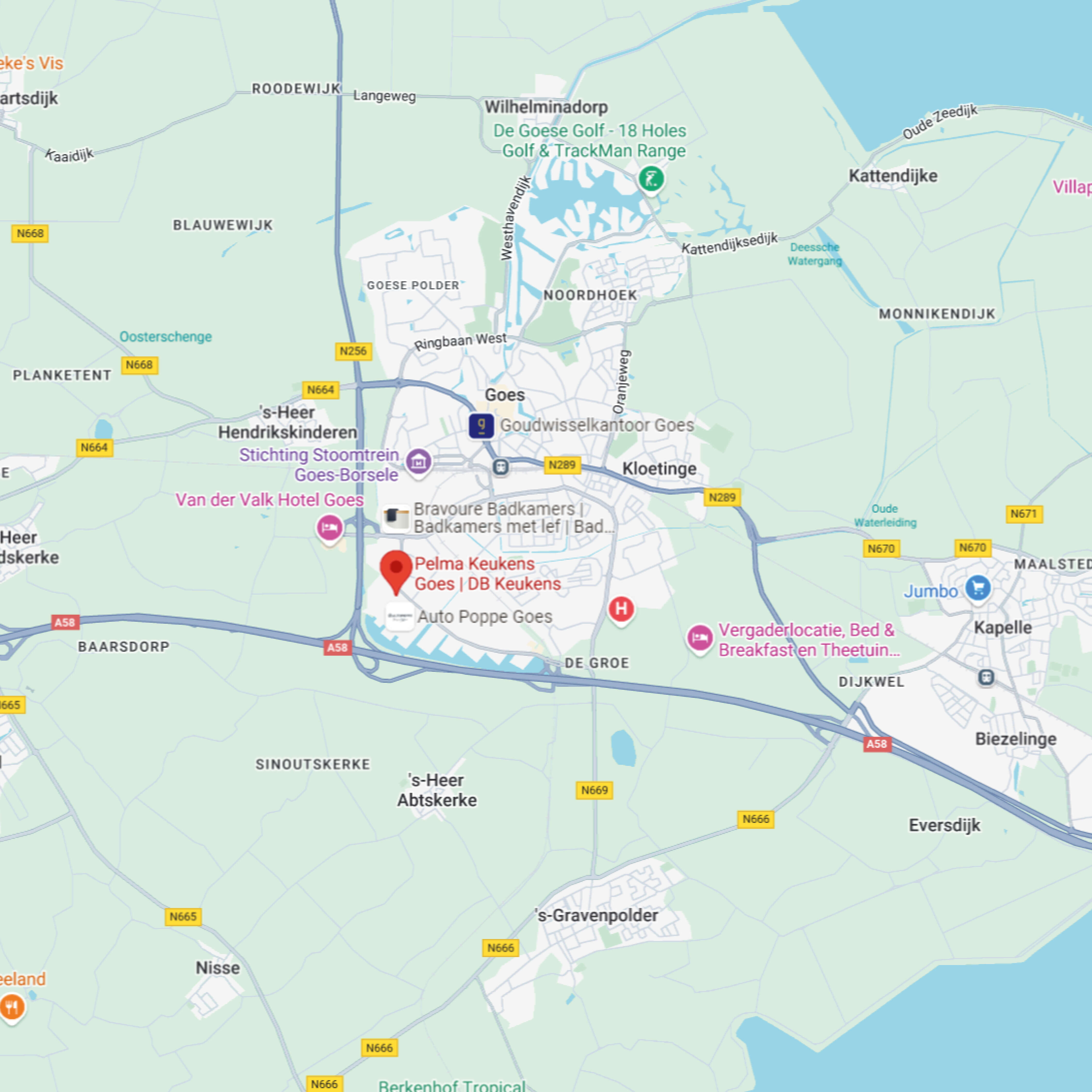 Onze keukenshowroom in Goes is gunstig gelegen en daardoor goed bereikbaar voor klanten uit onder andere België, Zuid-Beveland, Reimerswaal, Walcheren, Schouwen-Duiveland en Zeeuws-Vlaanderen. Dankzij de ligging vlak bij de A58 rijdt u er eenvoudig naartoe. U kunt gratis voor de deur parkeren en ook aan elektrische rijders is gedacht: er zijn meerdere oplaadpunten beschikbaar.
